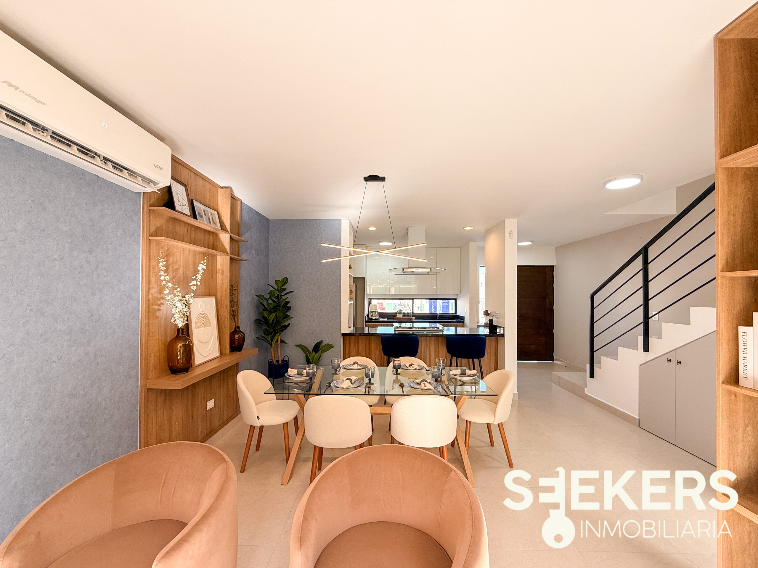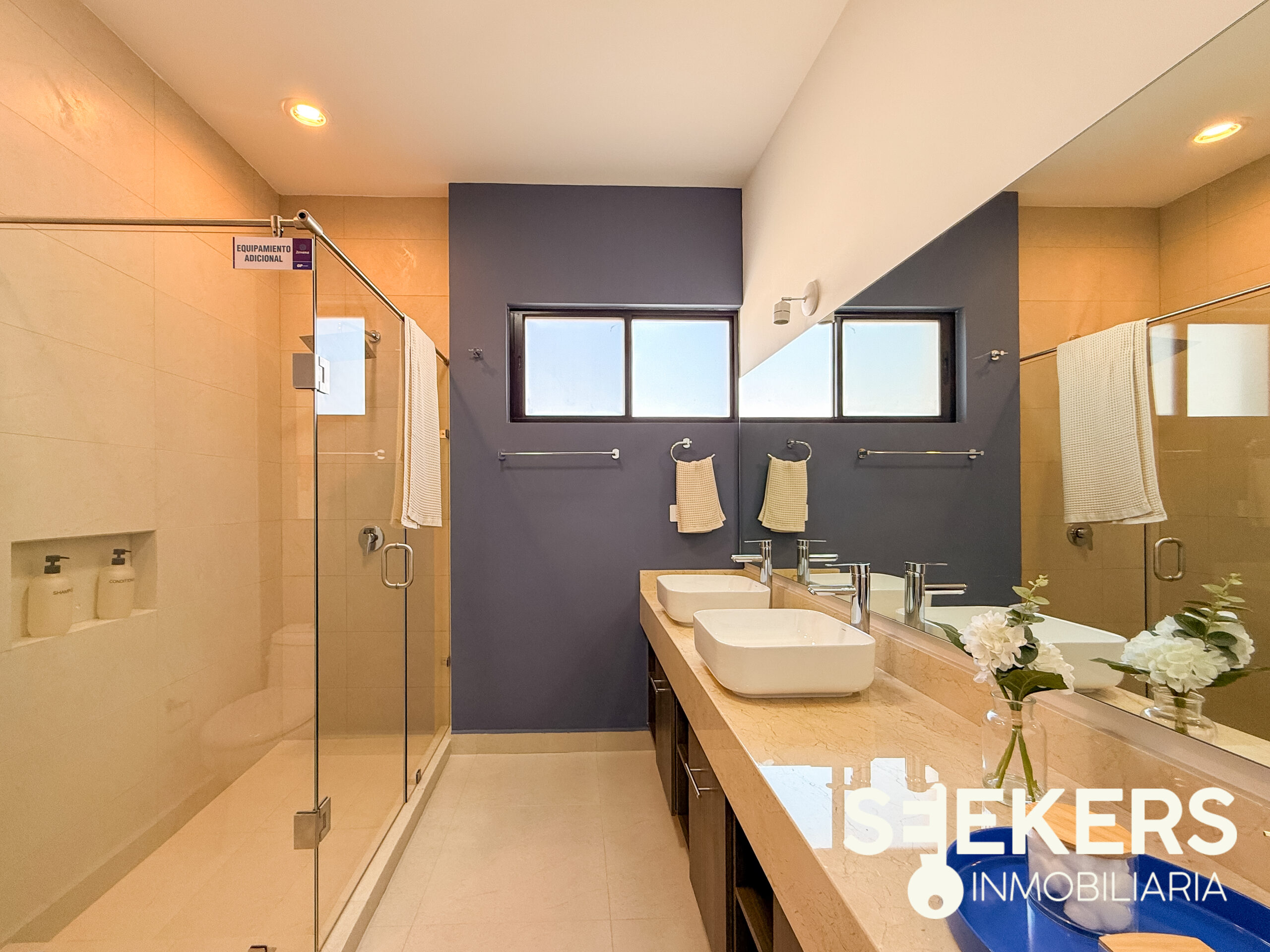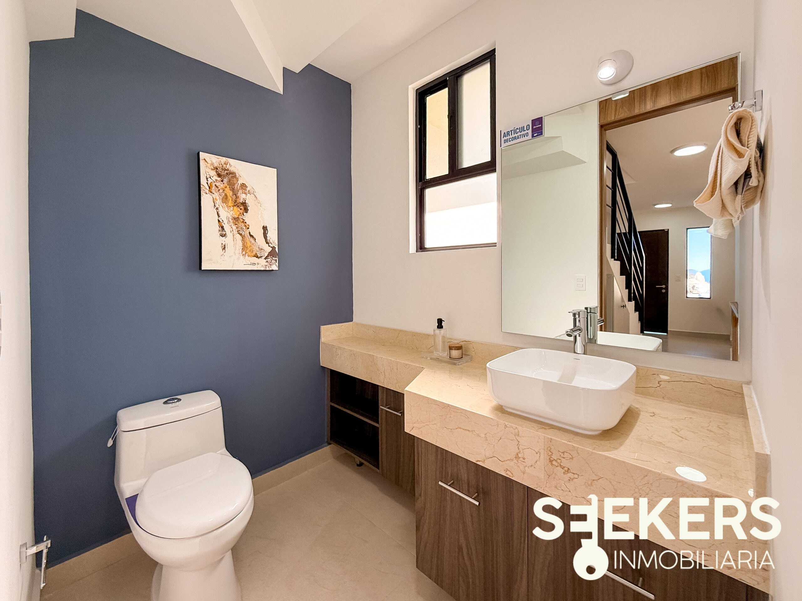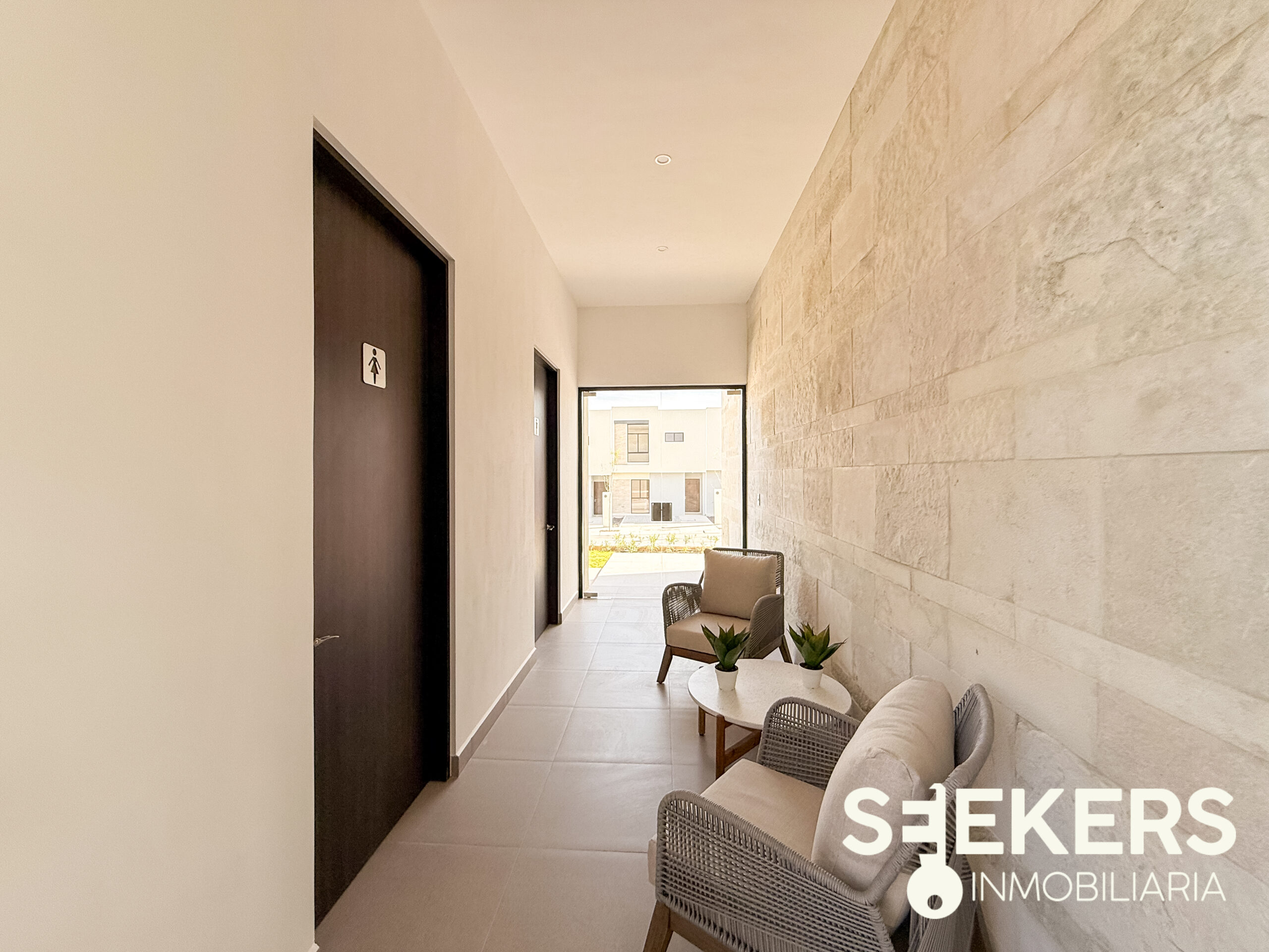 En el segundo nivel, la casa integra un espacio de escritorio, perfecto para home office o área de estudio. La recámara secundaria cuenta con baño completo privado, ofreciendo independencia y confort. La recámara principal destaca por su amplitud, al incluir vestidor y baño completo, creando un espacio cómodo y bien organizado para el descanso.