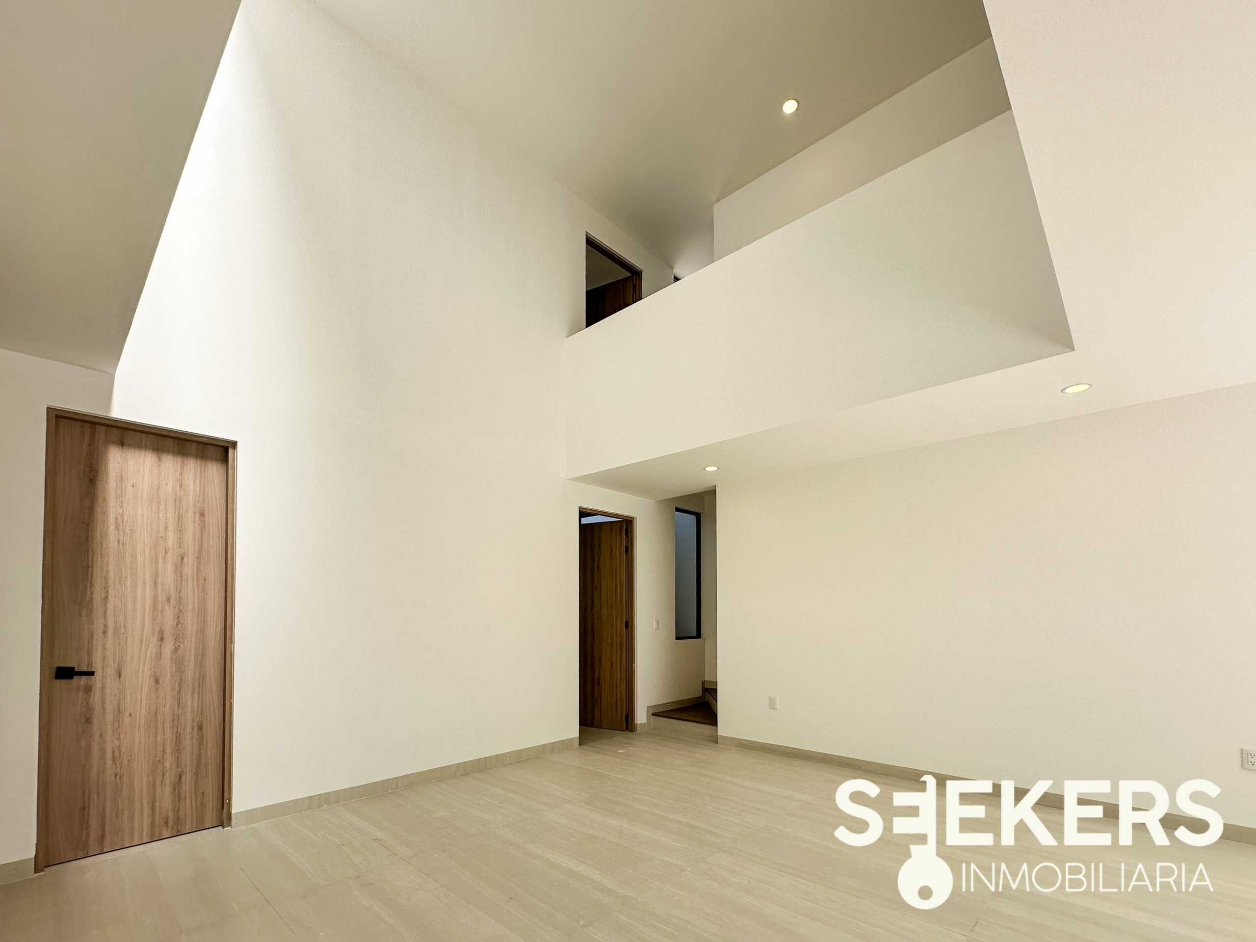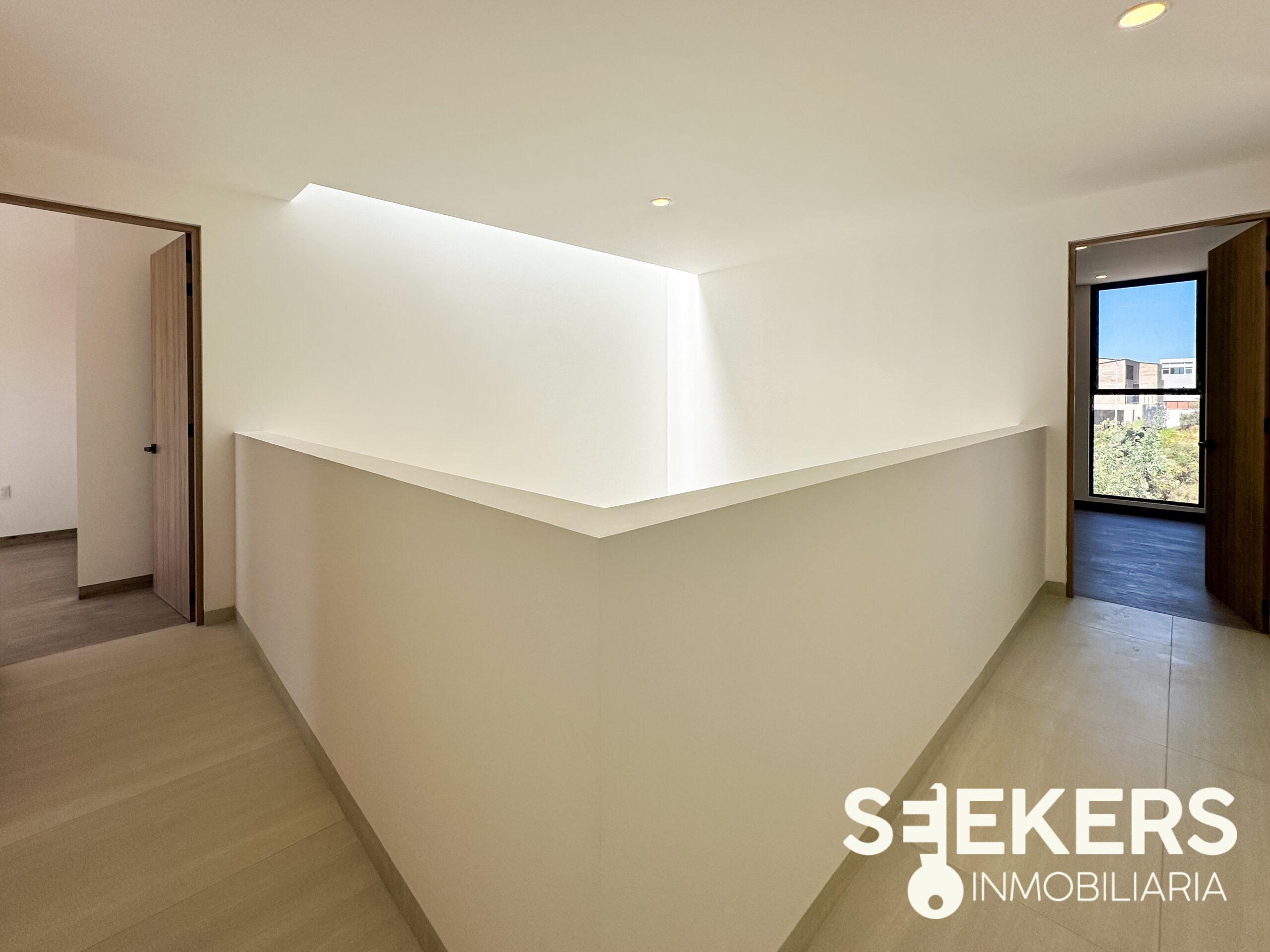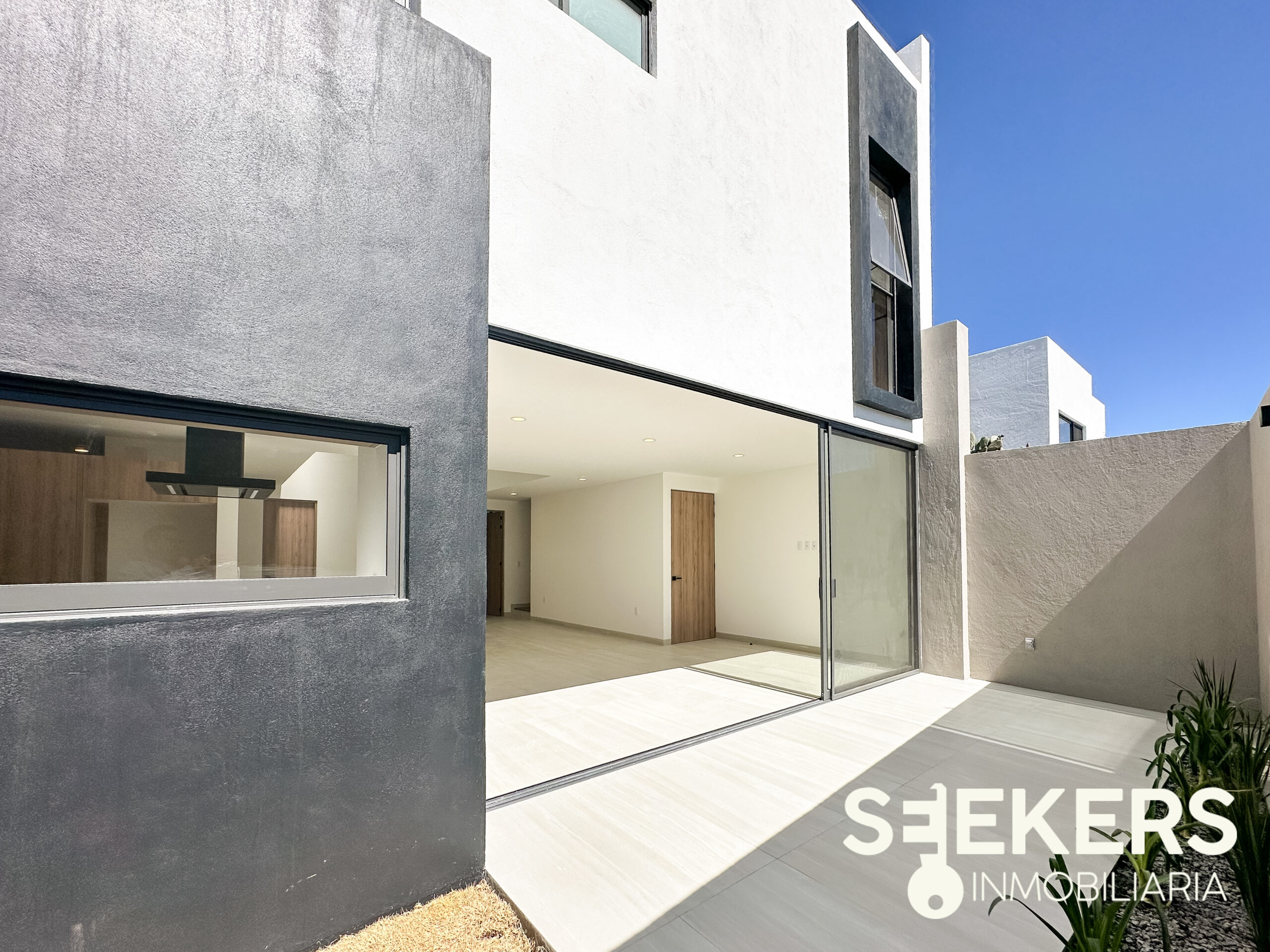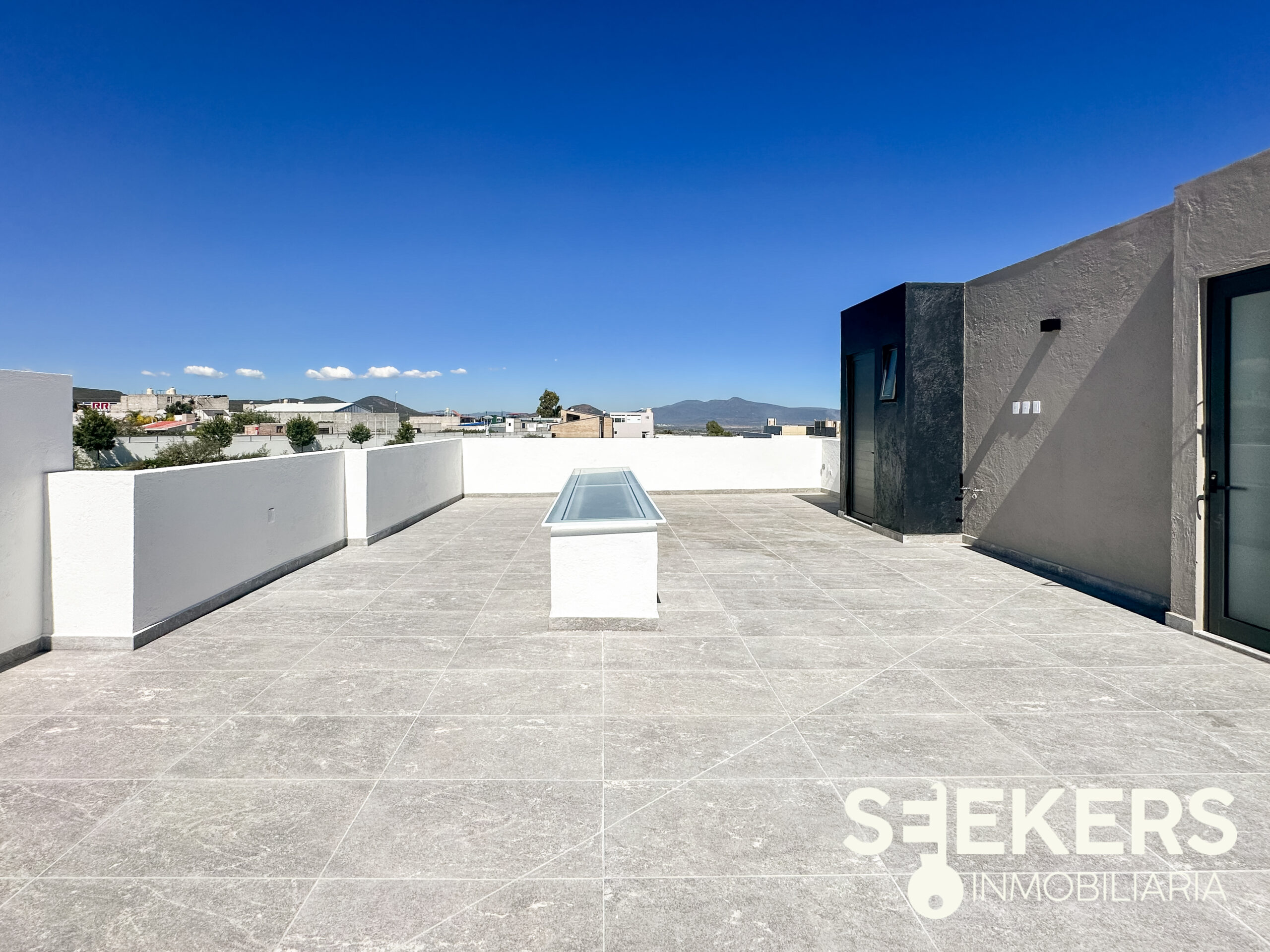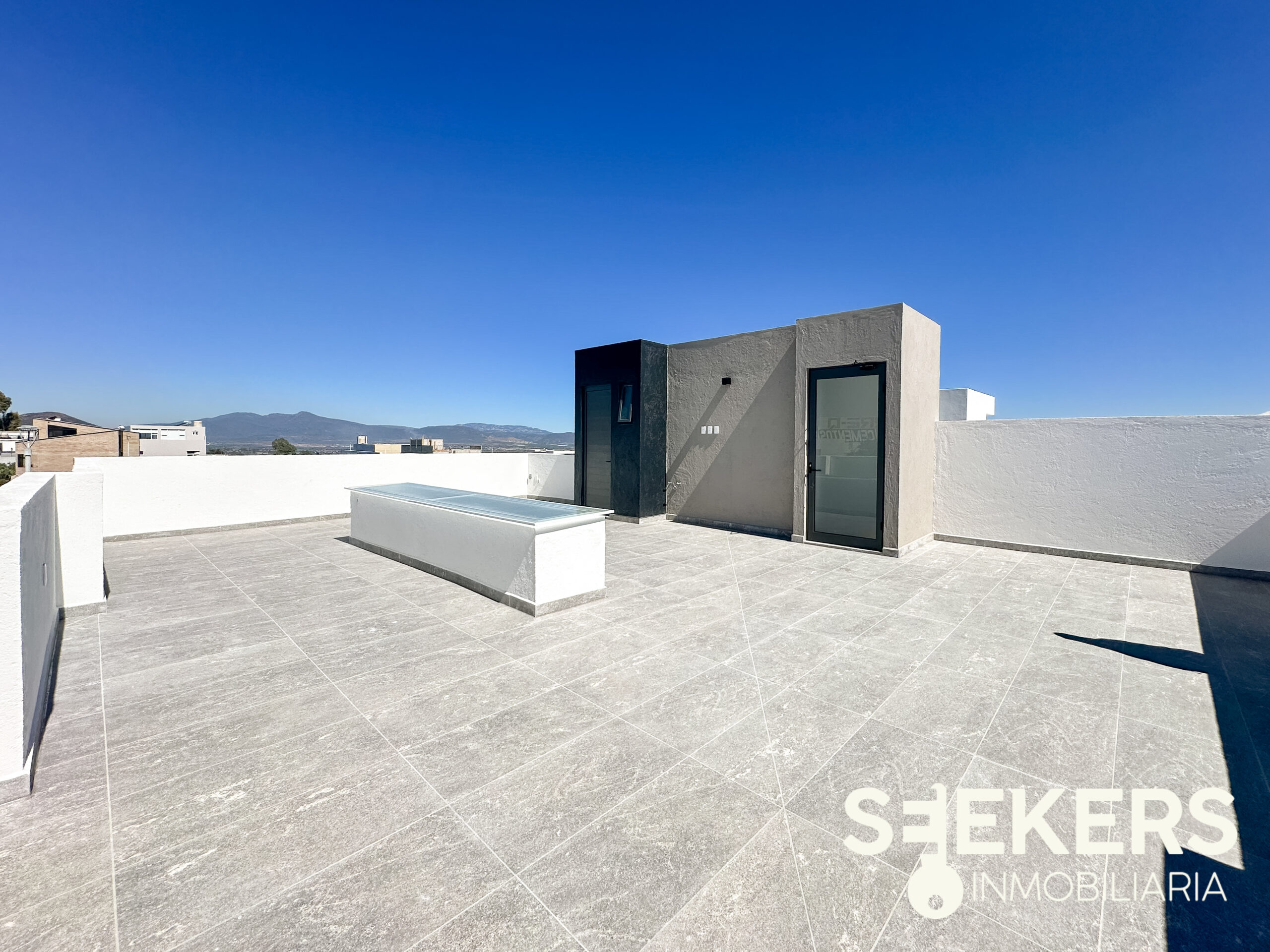 Casa en venta en Querétaro, ubicada en fraccionamiento con seguridad y excelente distribución. Construida en dos niveles más roof garden, esta propiedad es ideal para quienes buscan casas para familias en Querétaro o casas con roof garden en Querétaro. En planta baja cuenta con cochera para 3 autos, estudio o cuarta recámara con baño completo y terraza, sala con doble altura, comedor con salida al jardín trasero, cocina integral equipada con barras de cuarzo, cuarto de lavado y bodega. En planta alta: recámara principal con amplio vestidor y baño con doble lavabo, dos recámaras secundarias con clóset, baño completo con canceles de cristal templado y lavabos de mármol, además de clóset de blancos. El tercer nivel ofrece un amplio roof garden con medio baño y vista panorámica. Una excelente opción en el mercado de casas en venta en Querétaro, cerca de escuelas y zonas comerciales. Ideal para vivir cómodamente o como casa para inversión en Querétaro