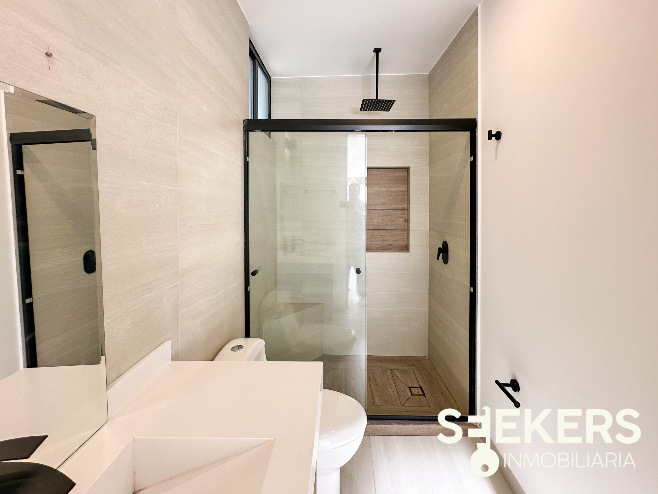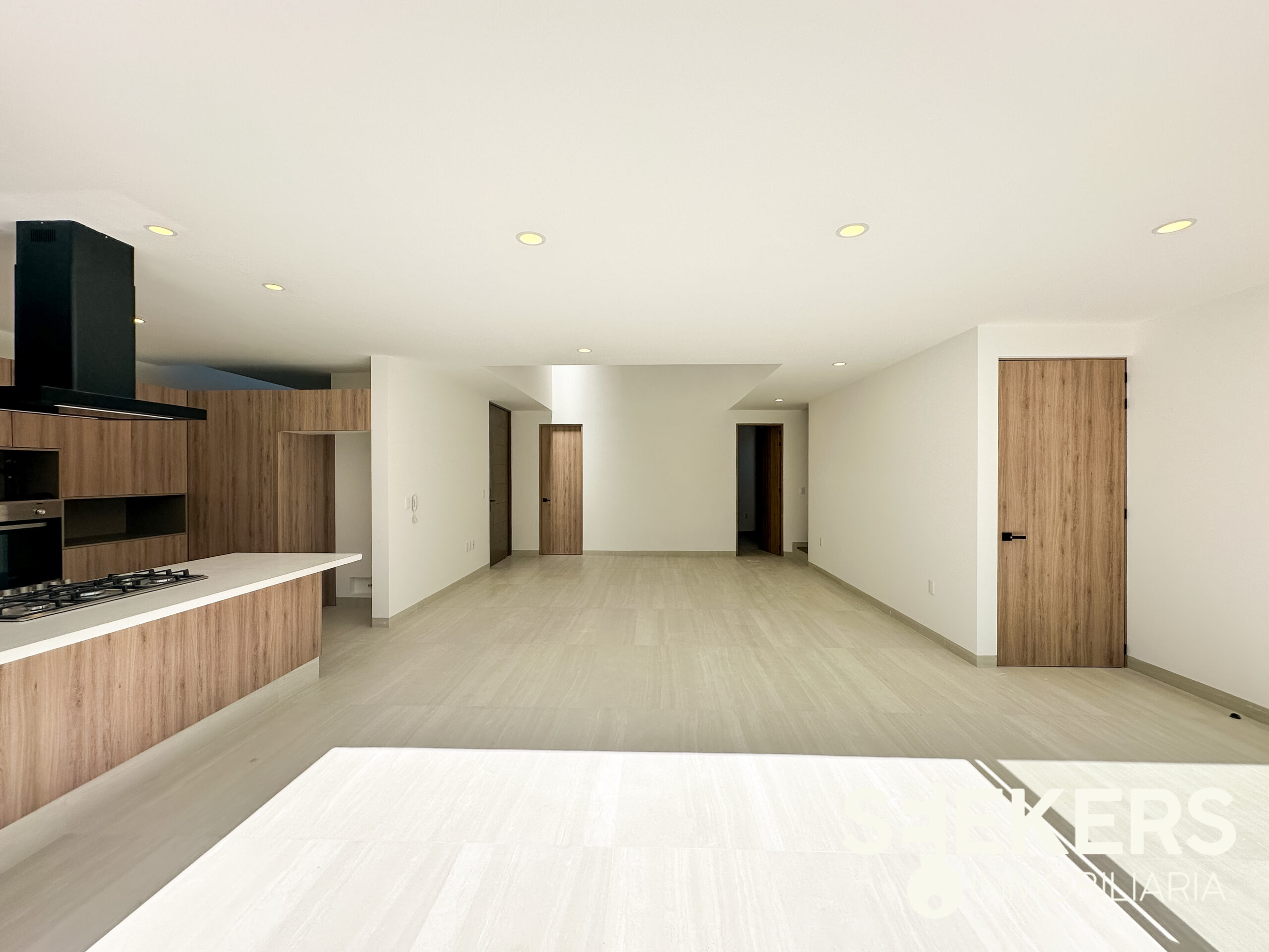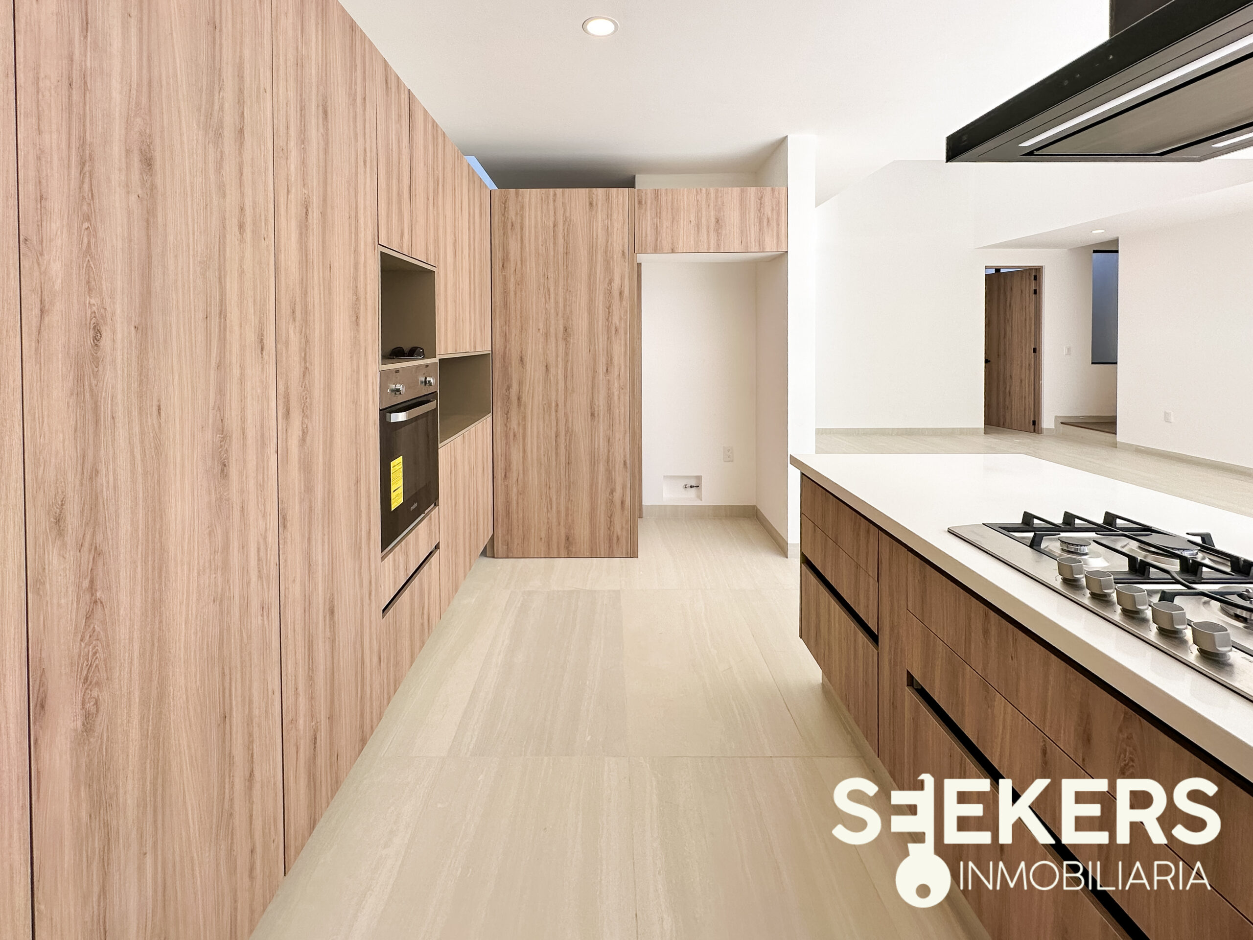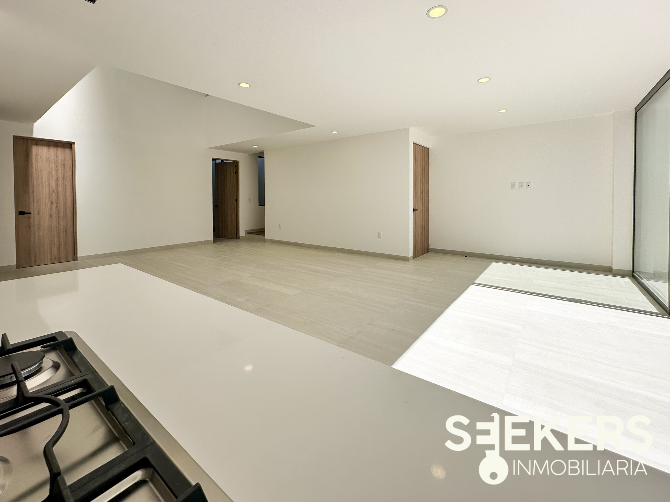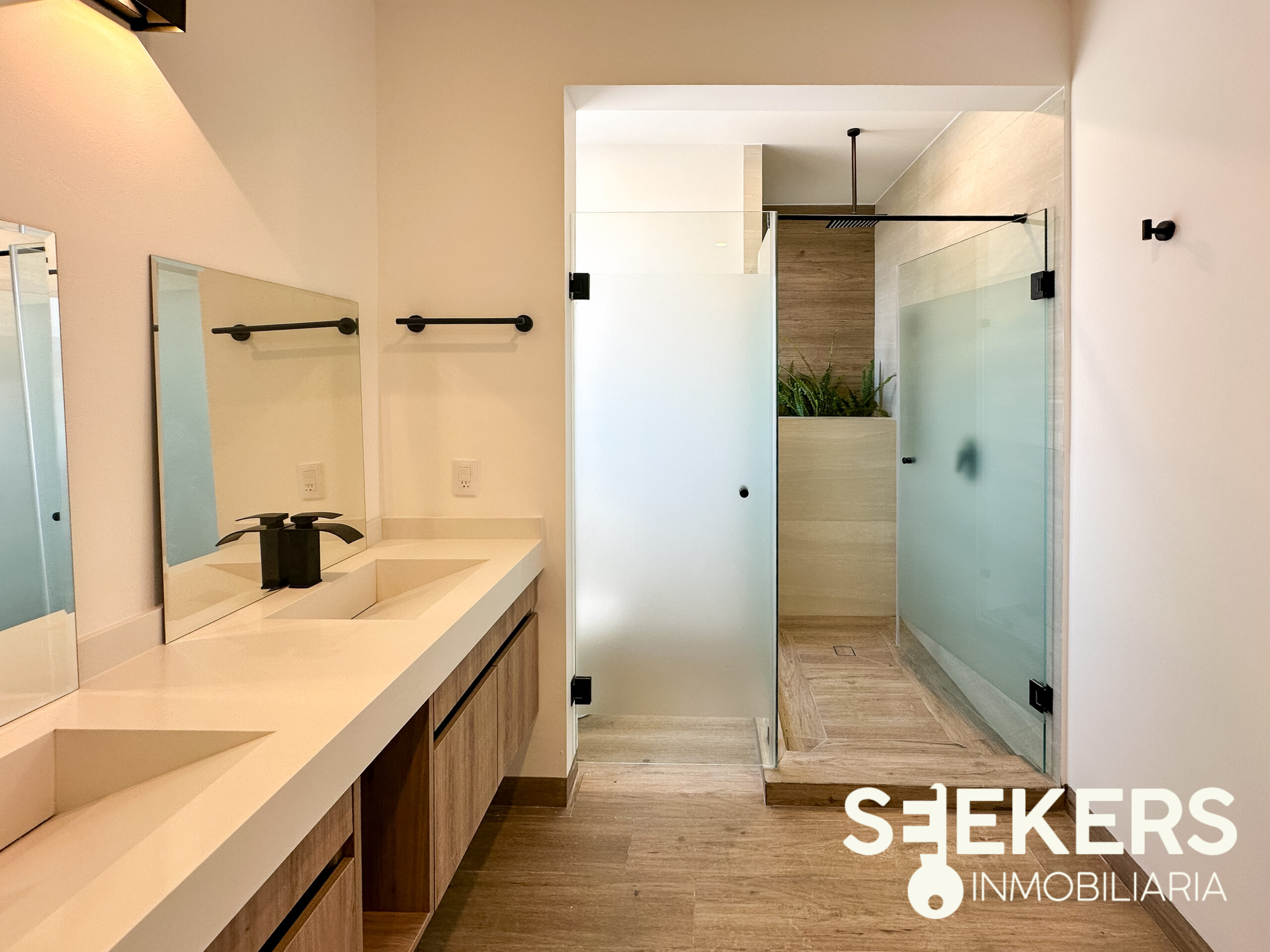 Acabados y equipamiento Hermoso árbol exterior en fachada Sala con doble altura Cocina integral totalmente equipada Barras de cuarzo en cocina Baños con canceles de cristal templado Lavabos de mármol