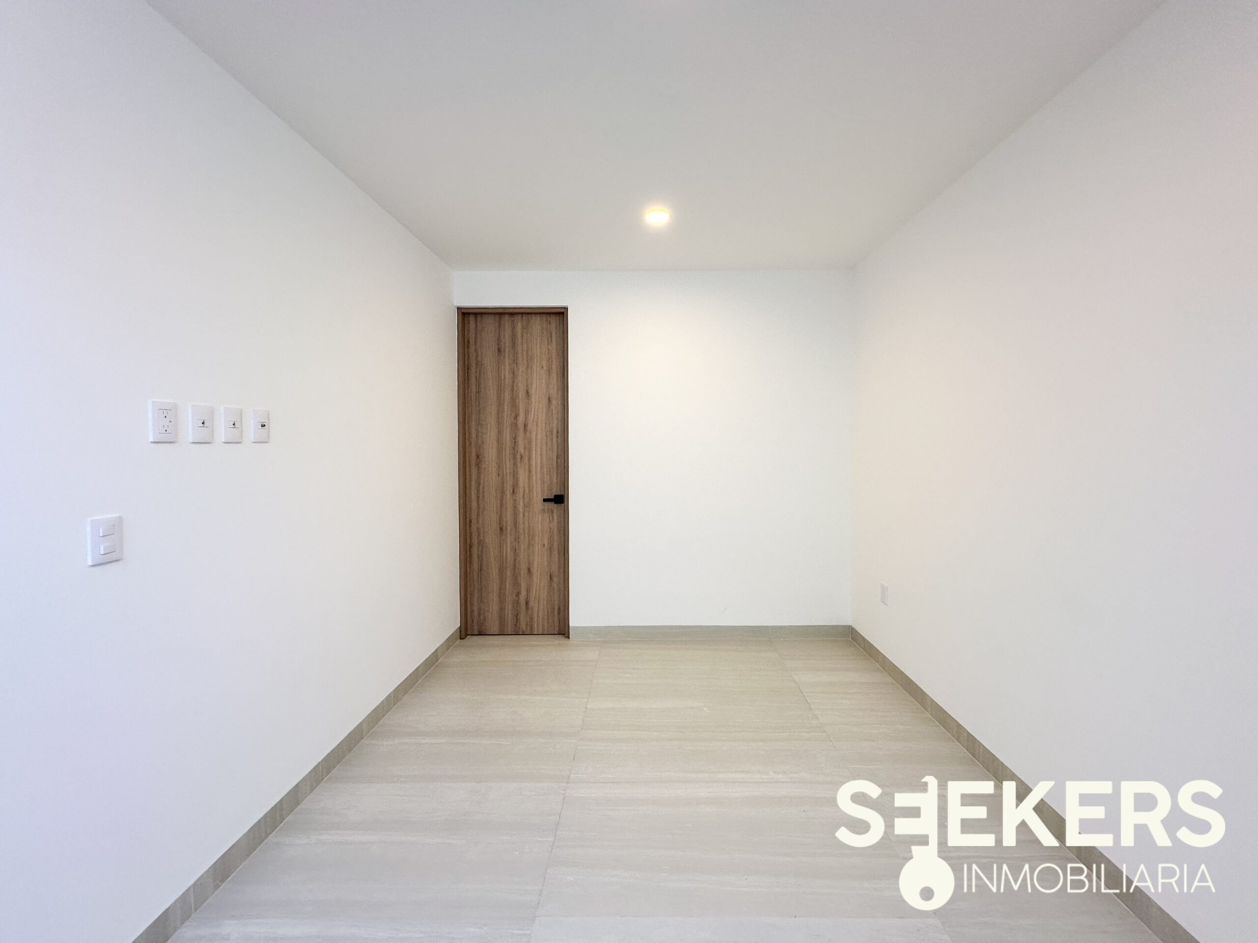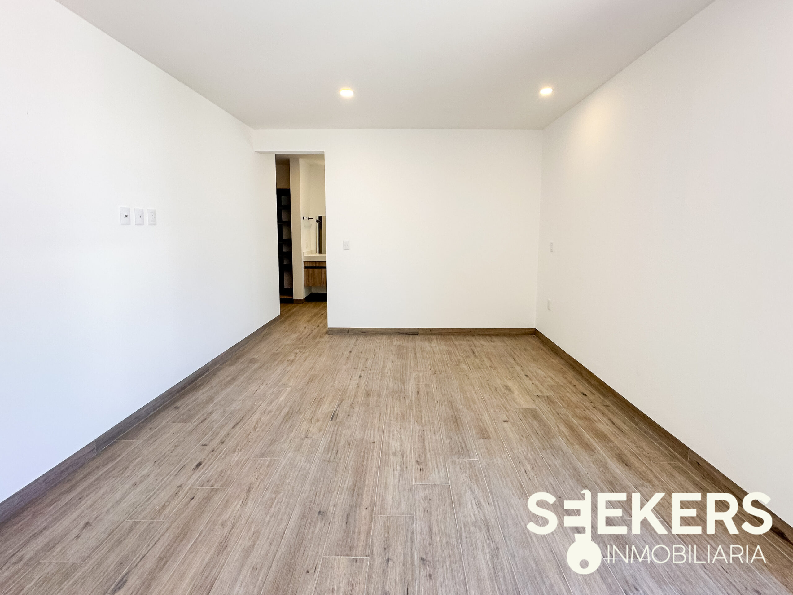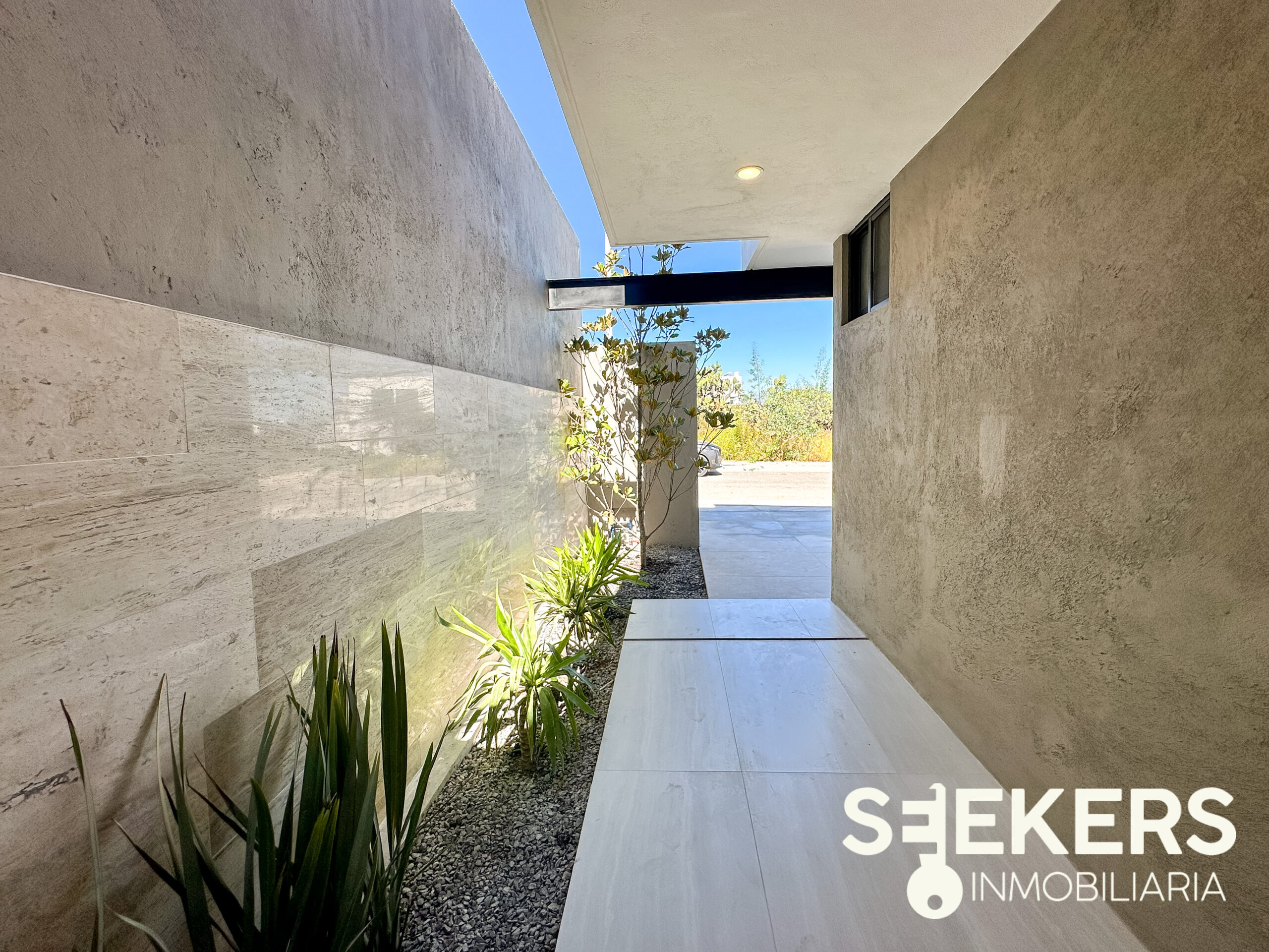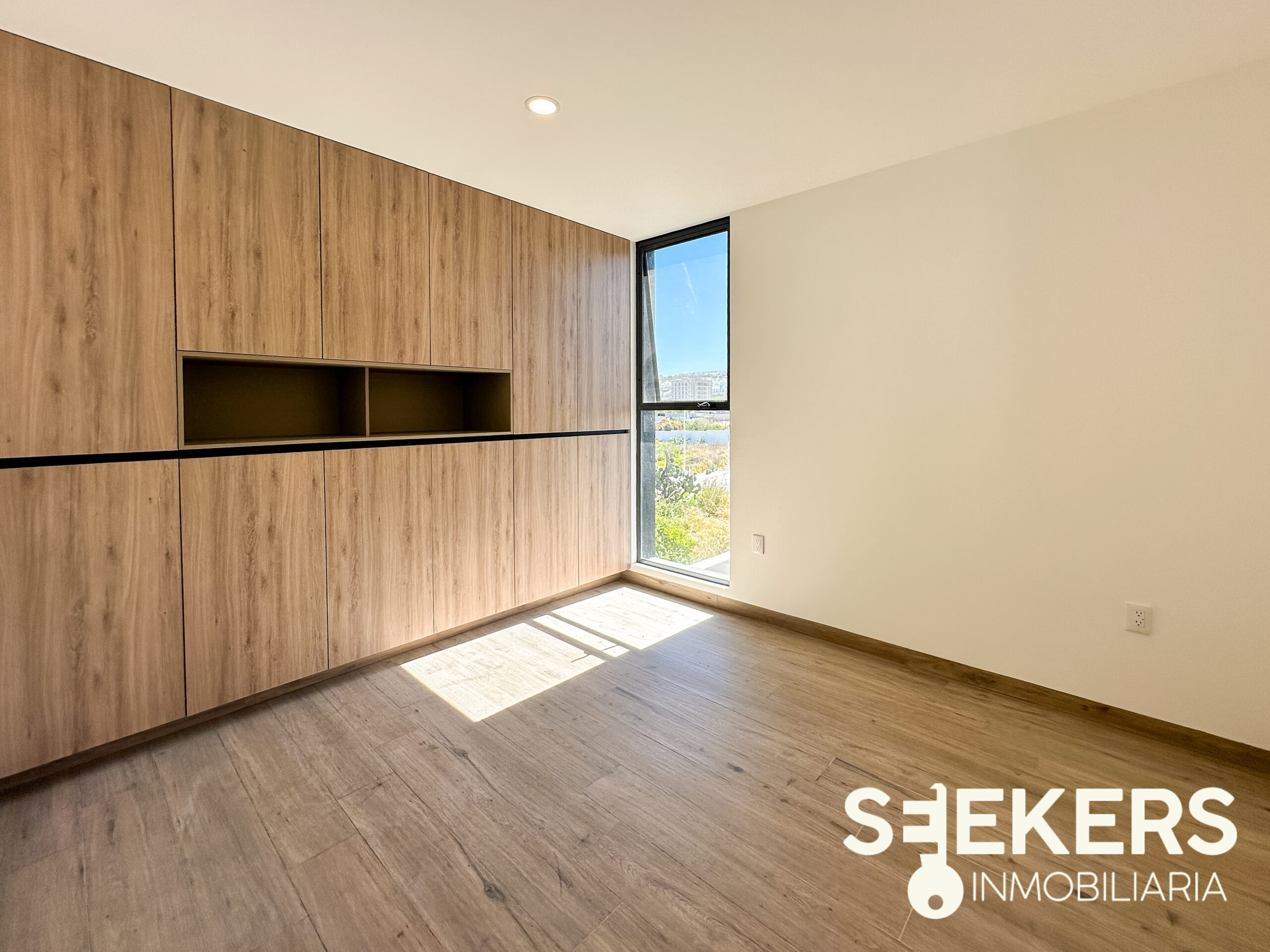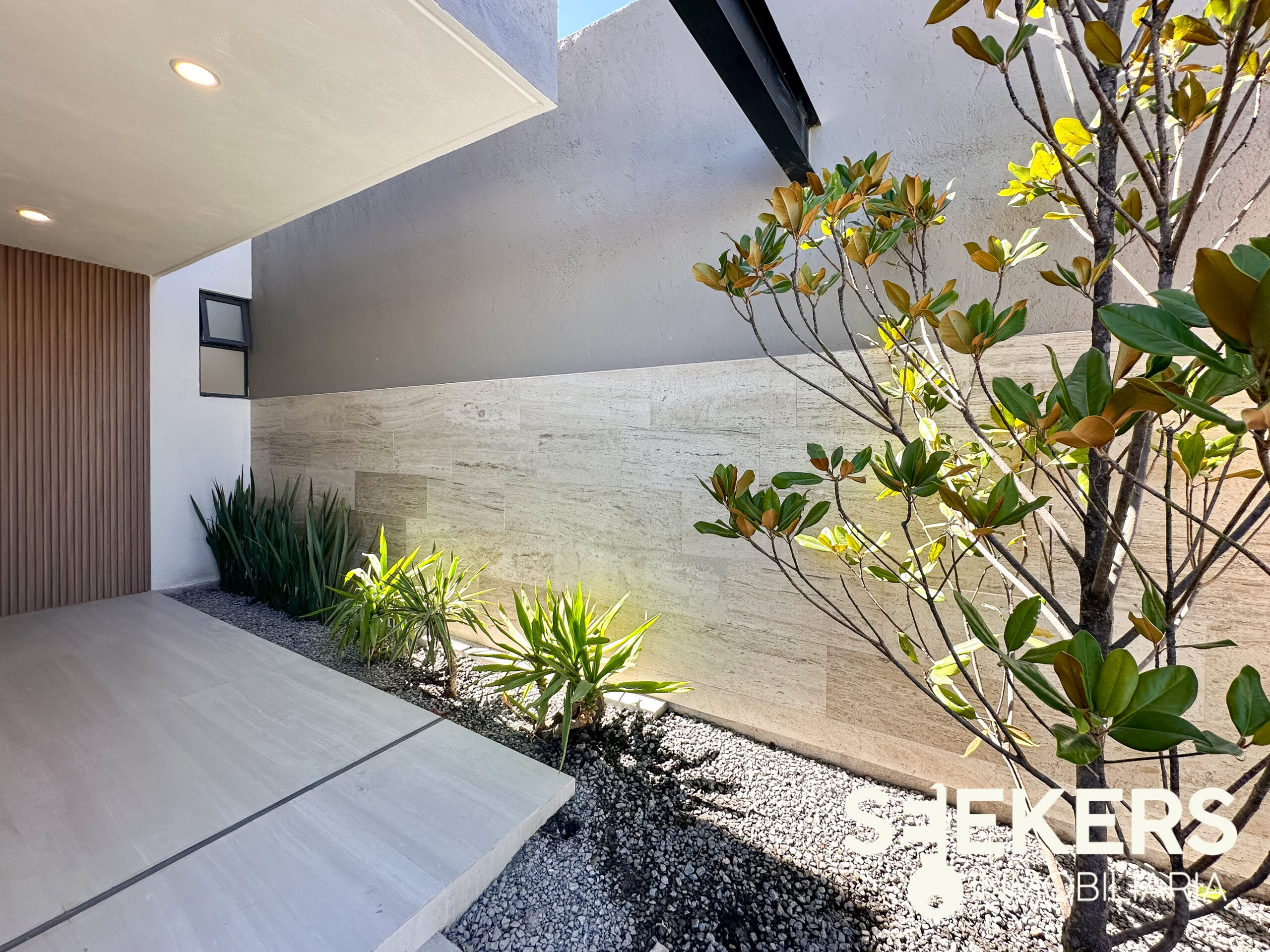 Acabados y equipamiento Hermoso árbol exterior en fachada Sala con doble altura Cocina integral totalmente equipada Barras de cuarzo en cocina Baños con canceles de cristal templado Lavabos de mármol