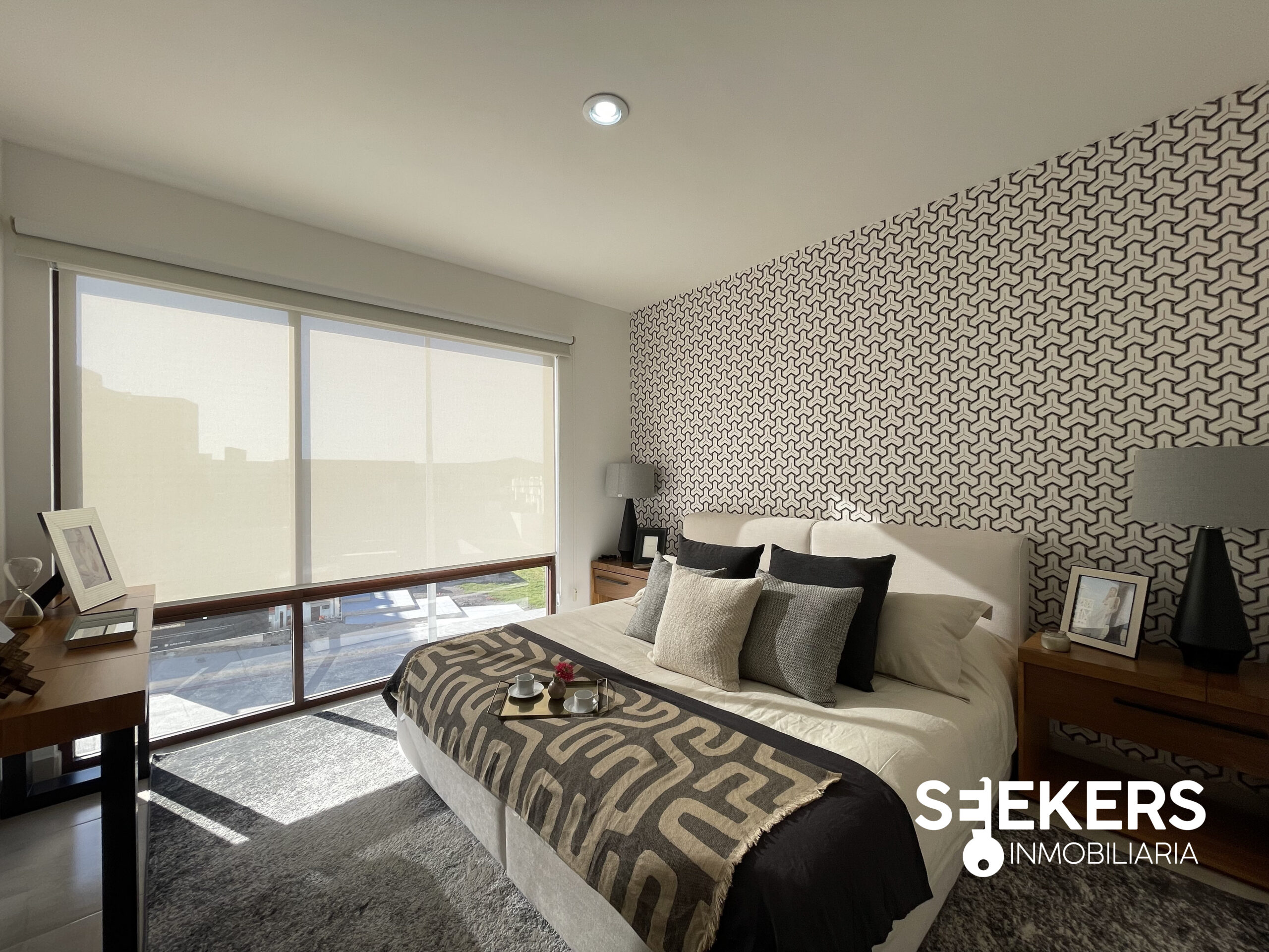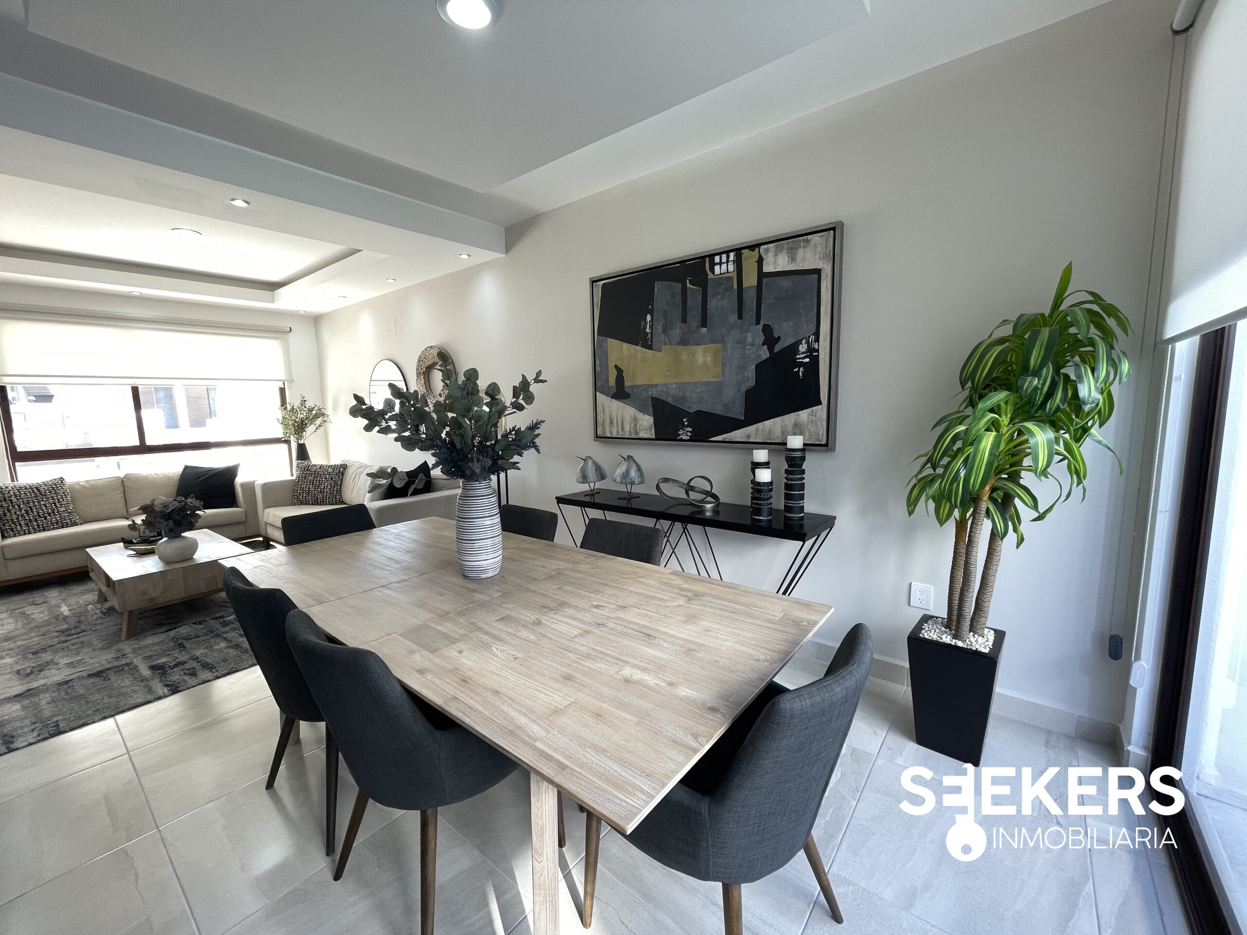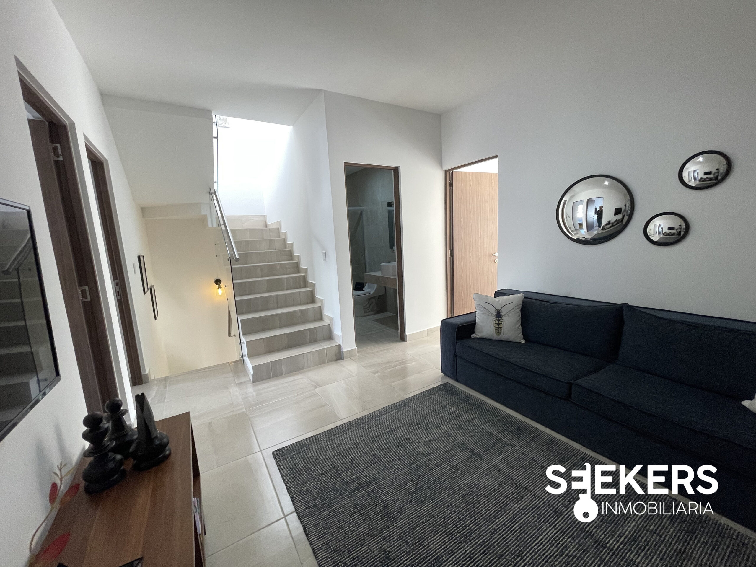 Pisos cerámicos de 60 cm X 60 cm. Alturas de 2.80 m con plafón en área social y luz indirecta blanca. Cancelería de aluminio tipo madera. Encimeras de marmol en baños con ovalín. Se entrega sin pasto La casa se entrega pintada totalmente en blanco. Pueden comprarla con o sin equipo.