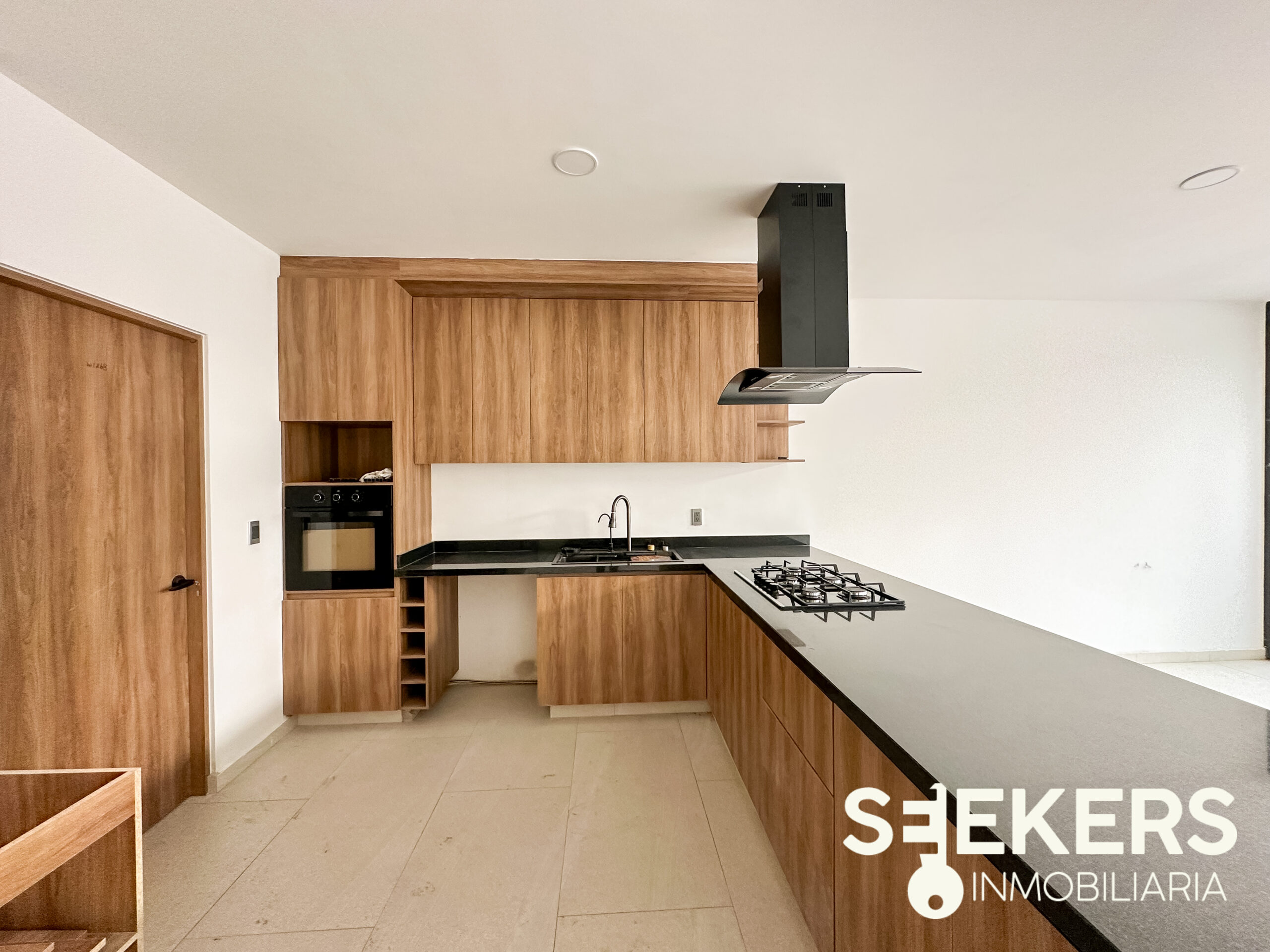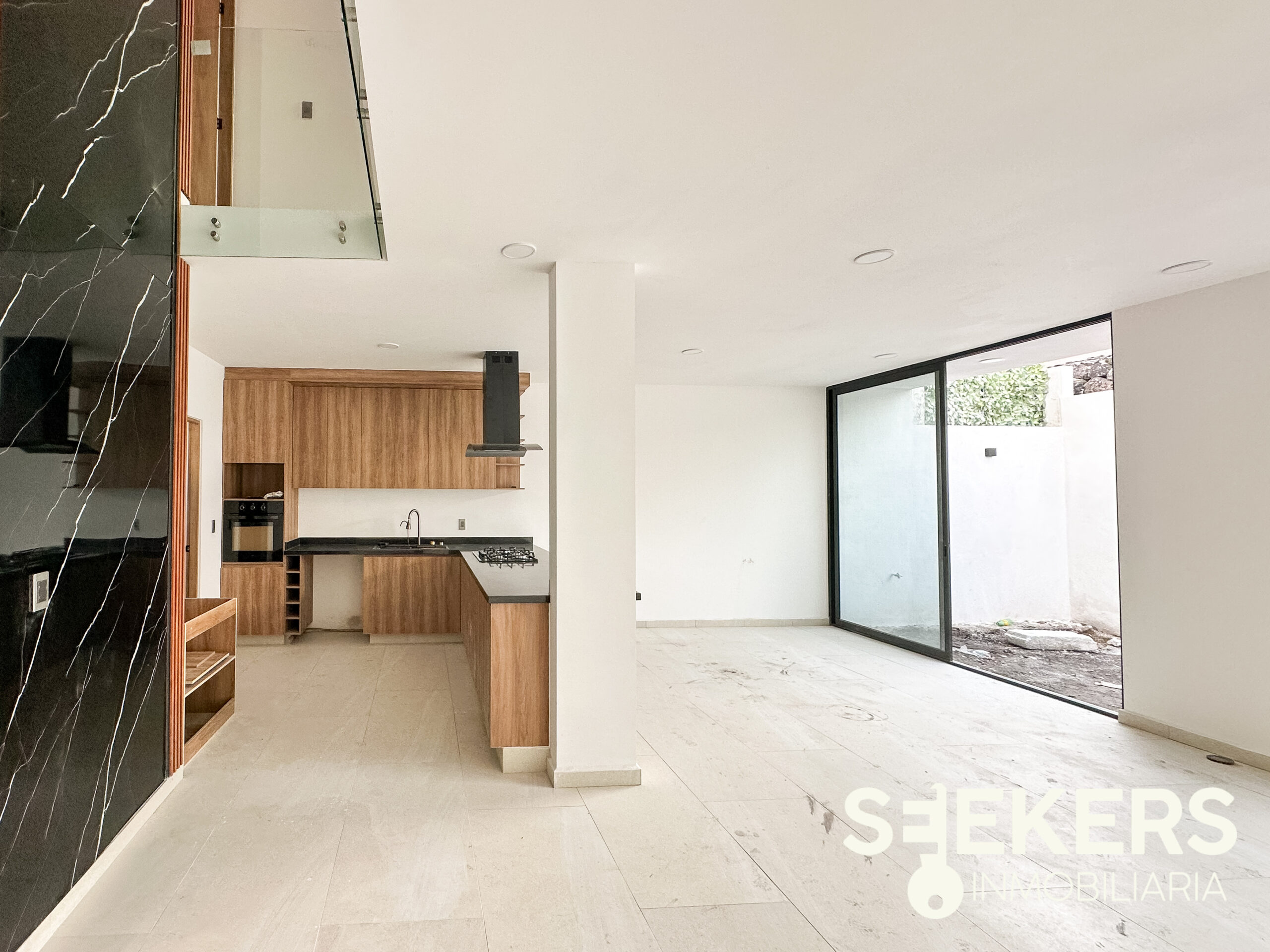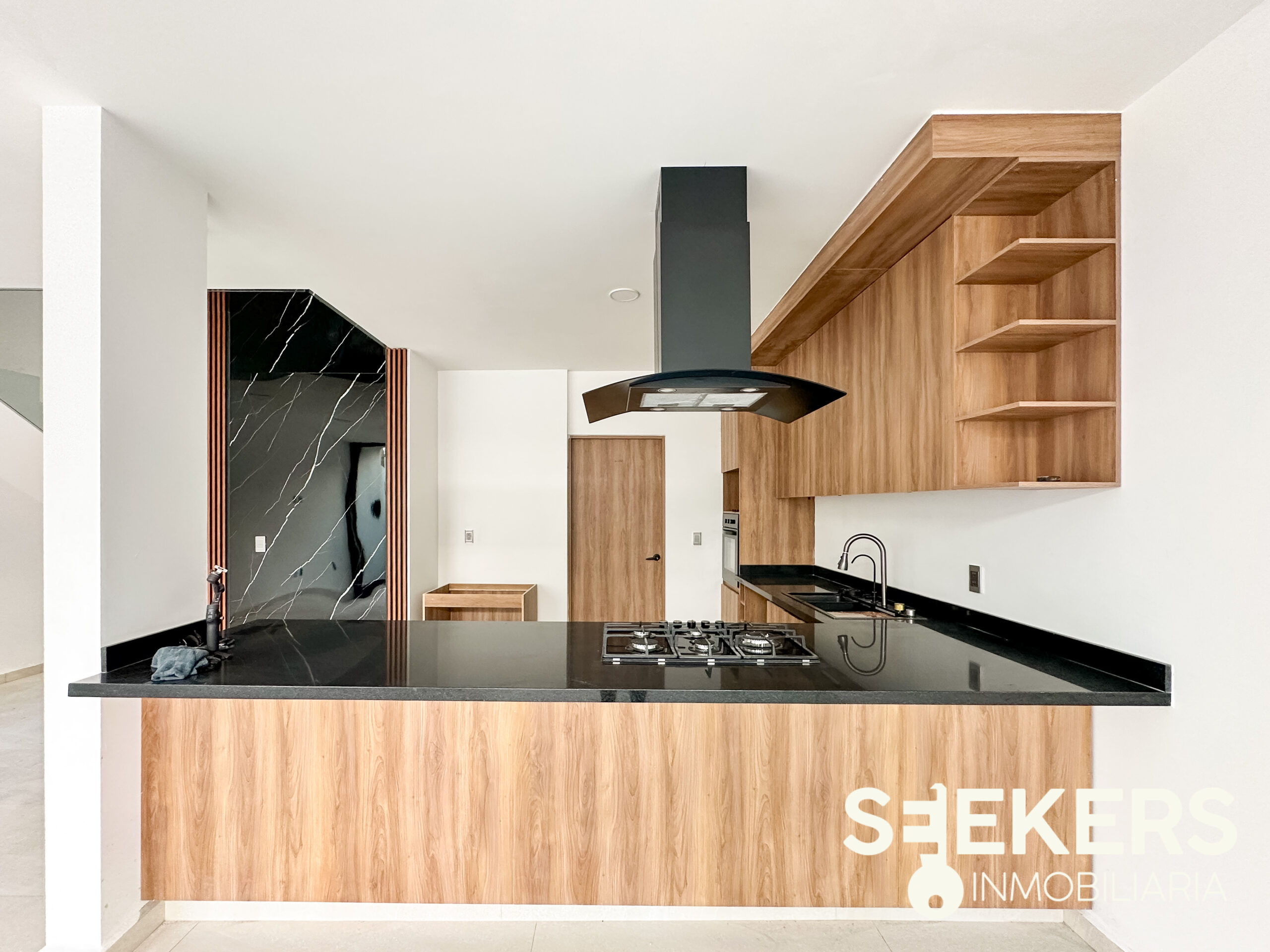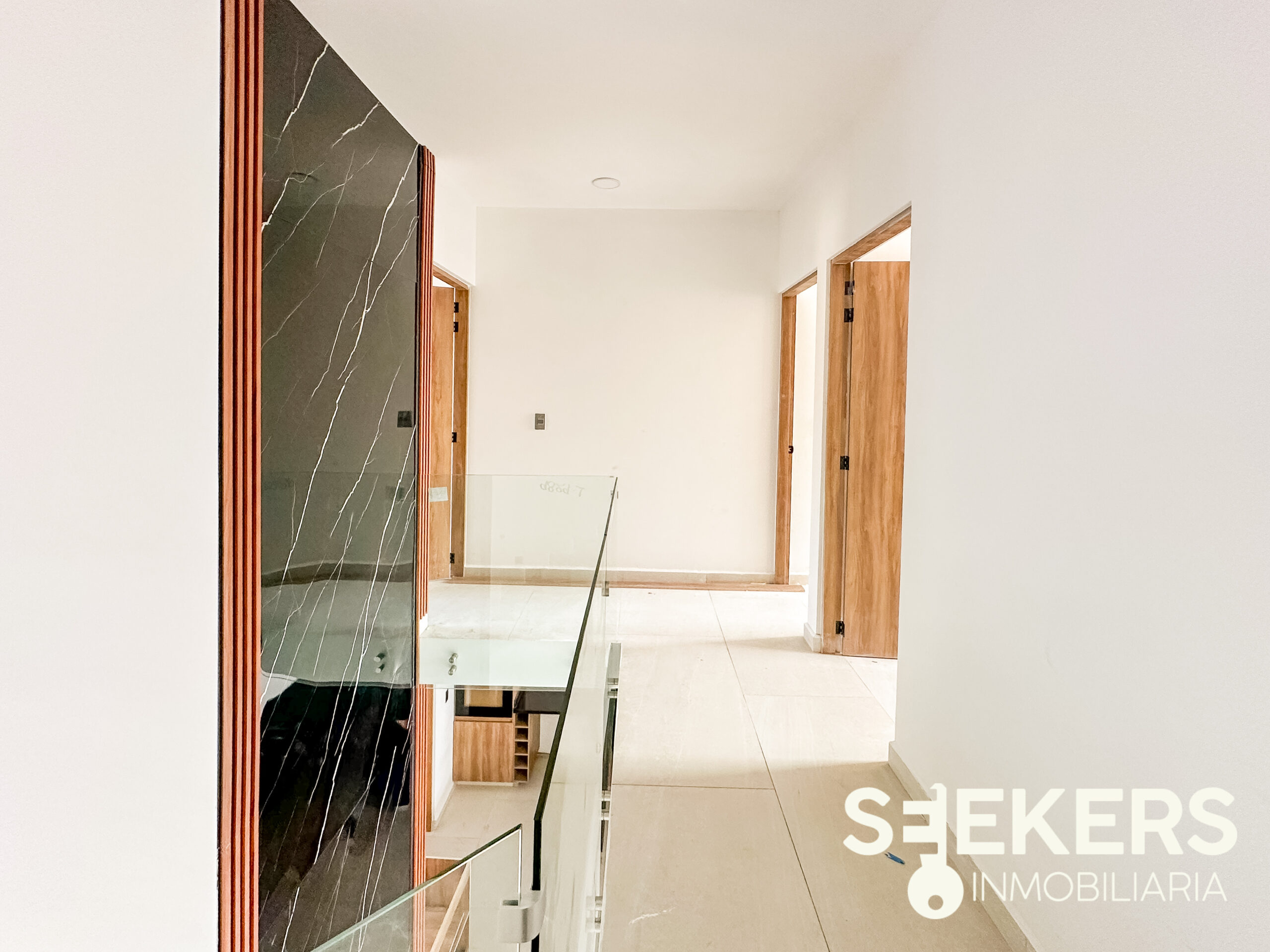 Alturas de 2.90m, Pisos de gran formato de 1.20m x .60m, Granito San Gabriel en barra de cocina, cancelería de aluminio, cristal templado en baños y barandal de escalera, presurizador y bomba sumergible en cisterna, decoraciones en paredes con lambrín de WPC, Corte de mármol Santo Tomas en Baños.