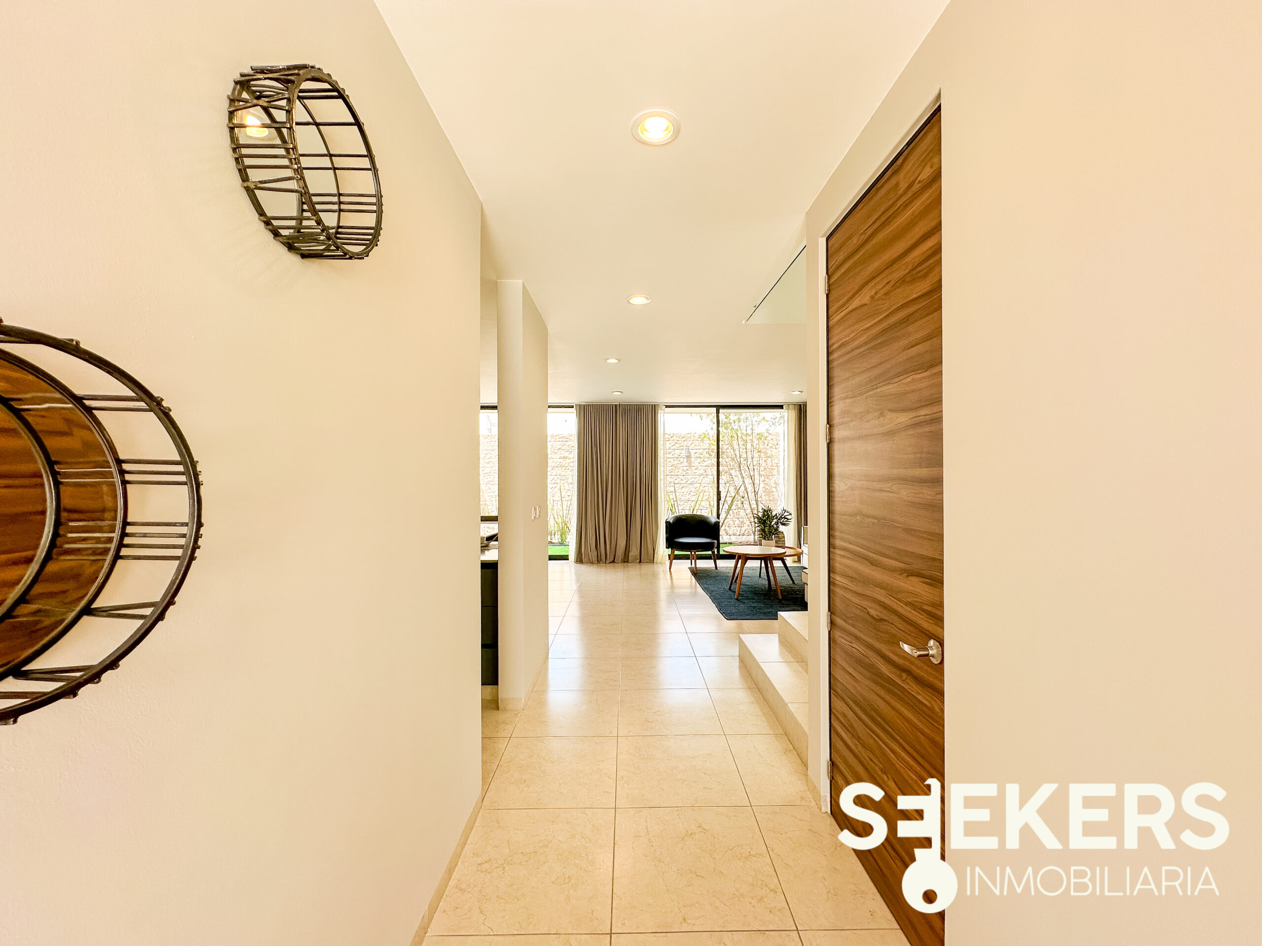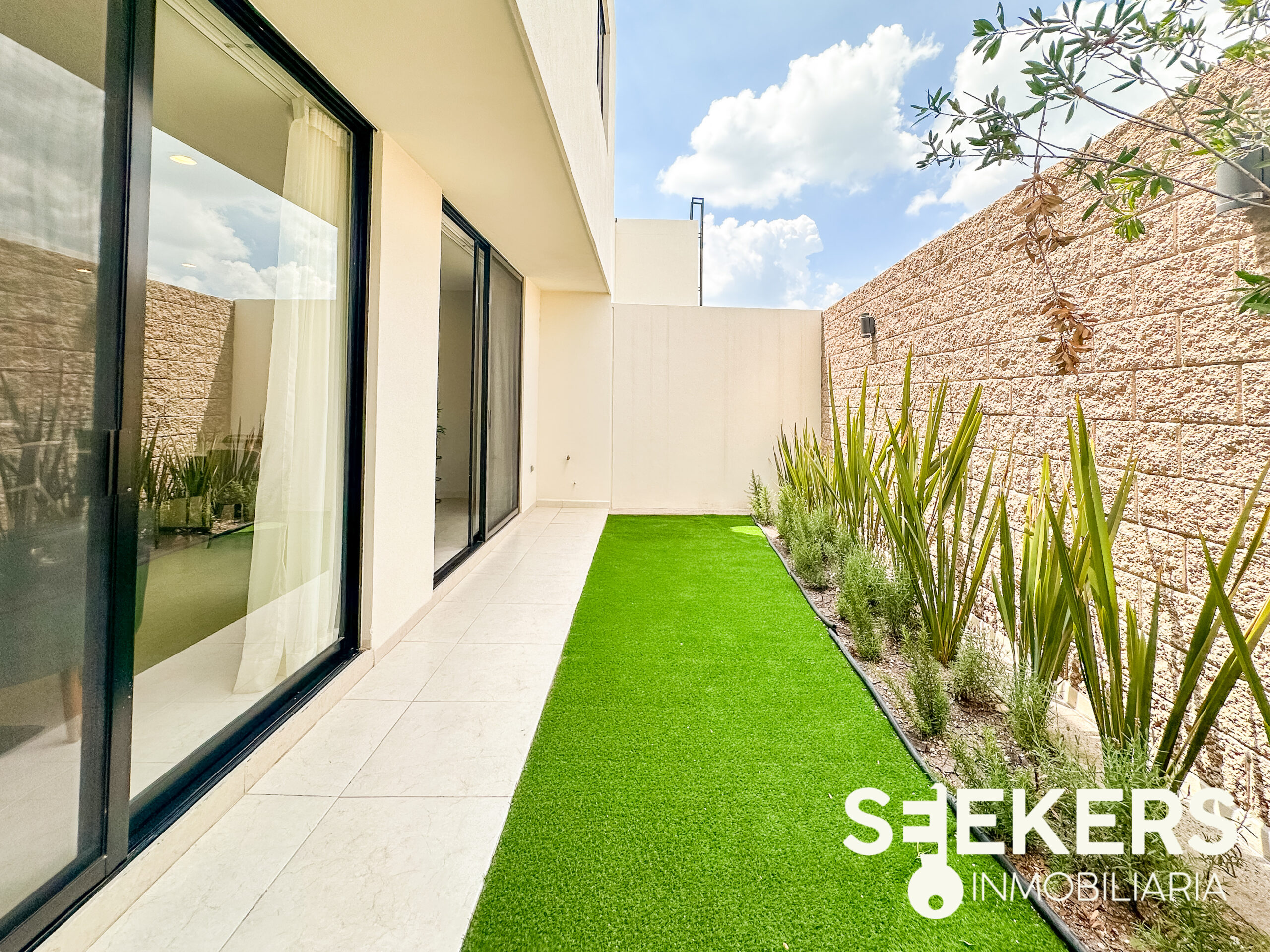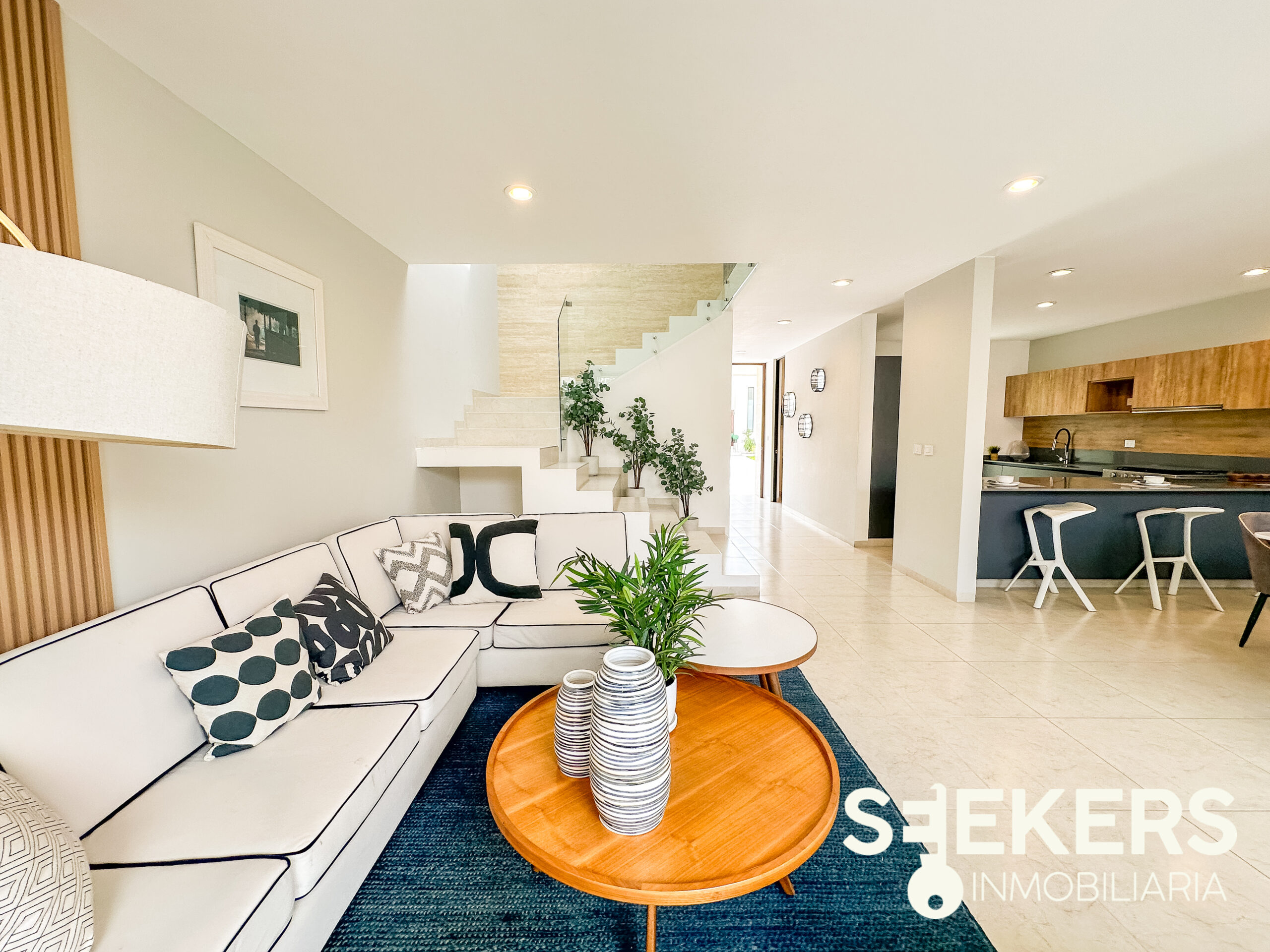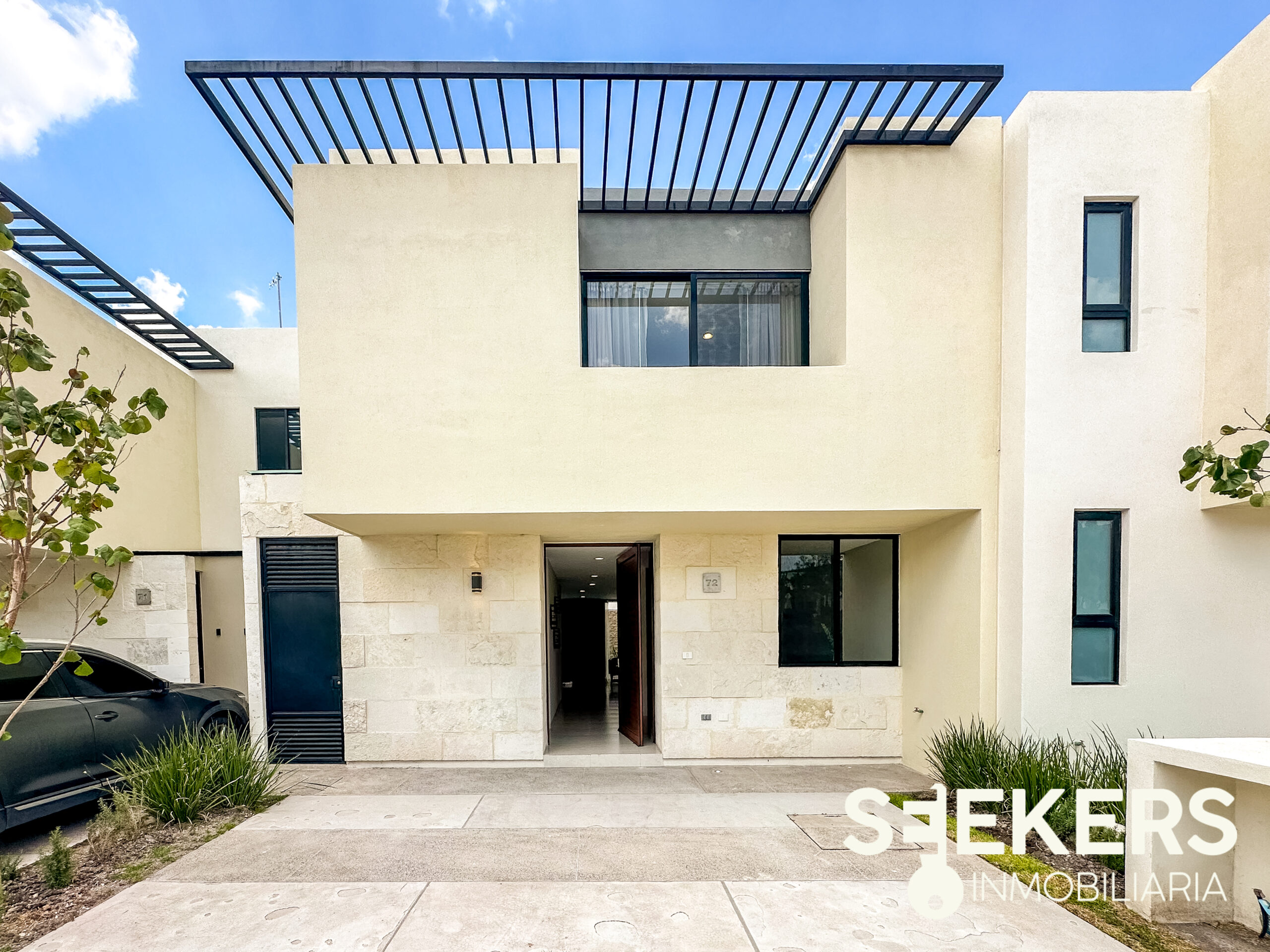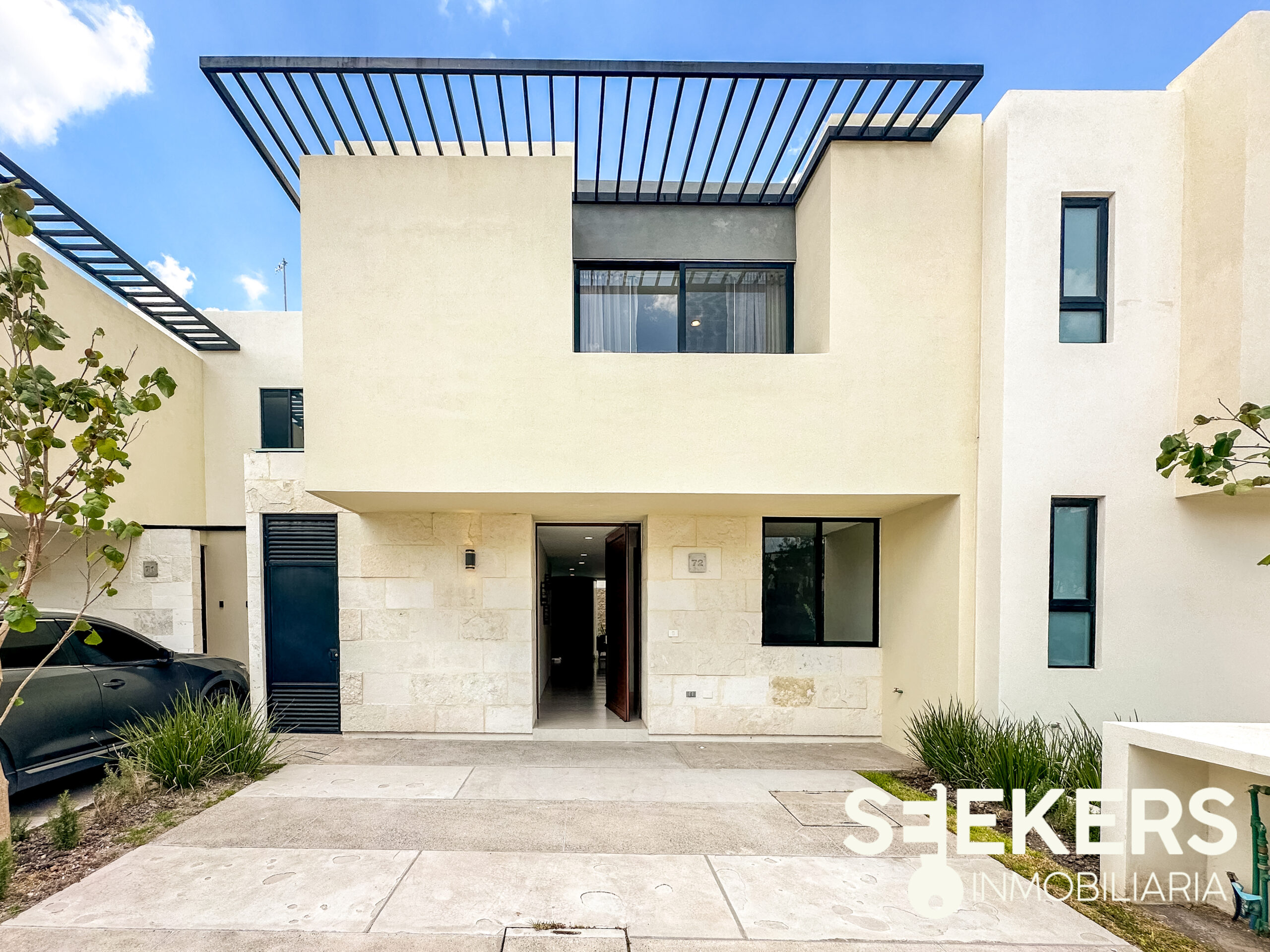 Fachada en piedra galarza. Puerta de aluminio estilo madera. Chapa electrónica. Pisos cerámicos de 60 cm X 60 cm. Cancelería europea de aluminio negro. Cocina con cuarzo color gris con estufa. Carpinterías en MDF modelo monarca. Canceles de baño de cristal templado. Vanities en los baños. La casa se entrega totalmente pintada de blanco. Se entrega sin pasto y sin espejos. La casa se puede adquirir con o sin equipo el equipamiento de la casa es cocina closets y canceles.