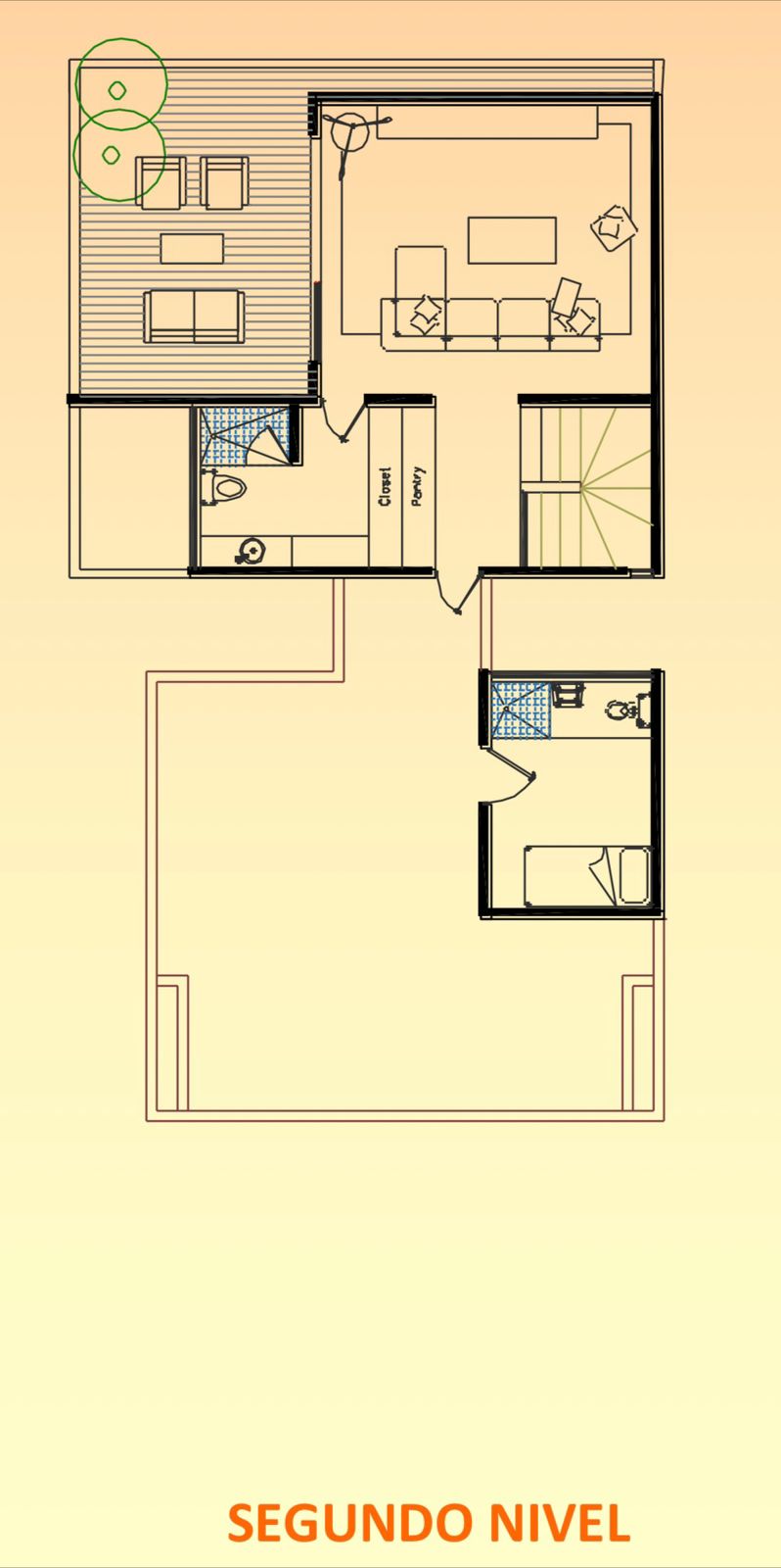 El segundo nivel ofrece un espectacular roof garden con terraza, estancia familiar, baño completo y cuarto de servicio con baño, además de la azotea destinada para equipos de aire acondicionado y paneles solares. Todo el proyecto está equipado con acabados premium como mármol travertino, duela cerámica en terrazas, cancelería negra, regaderas tipo lluvia, encimeras de mármol en baños y detalles en piedra natural.