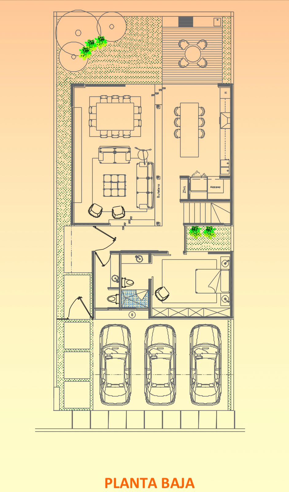 En la planta baja encontrarás una cochera techada para tres autos, acceso principal con puerta de madera tropical de gran presencia y una recámara de visitas con baño completo, ideal para estancias prolongadas o para funcionar como estudio. La zona social ofrece un comedor de concepto abierto con salida directa a la terraza jardín, además de una cocina equipada con encimeras de cuarzo, isla desayunadora, parrilla eléctrica, horno, campana y lavavajillas. También incluye medio baño para visitas, área techada para herramientas o bicicletas y pasillo de servicio. Las áreas verdes suman 40.25 m², perfectas para disfrutar del clima de Querétaro.