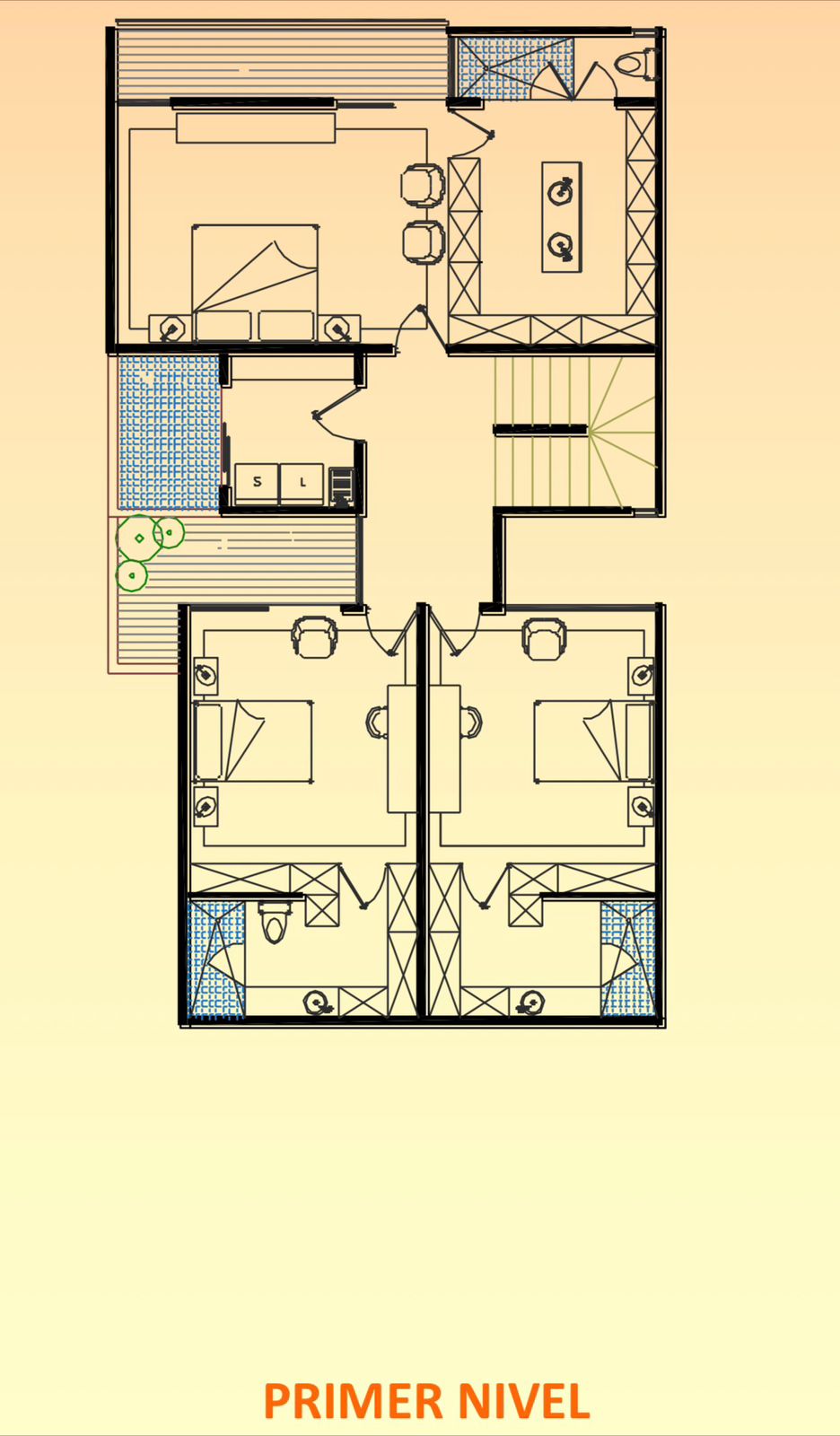 En el primer nivel se ubican tres recámaras amplias, todas con vestidor y baño completo. La recámara principal integra una terraza techada y lavabo doble, mientras que una de las secundarias también cuenta con terraza privada. En este nivel se encuentra además la lavandería techada con patio de tendido cerrado, brindando practicidad al día a día.